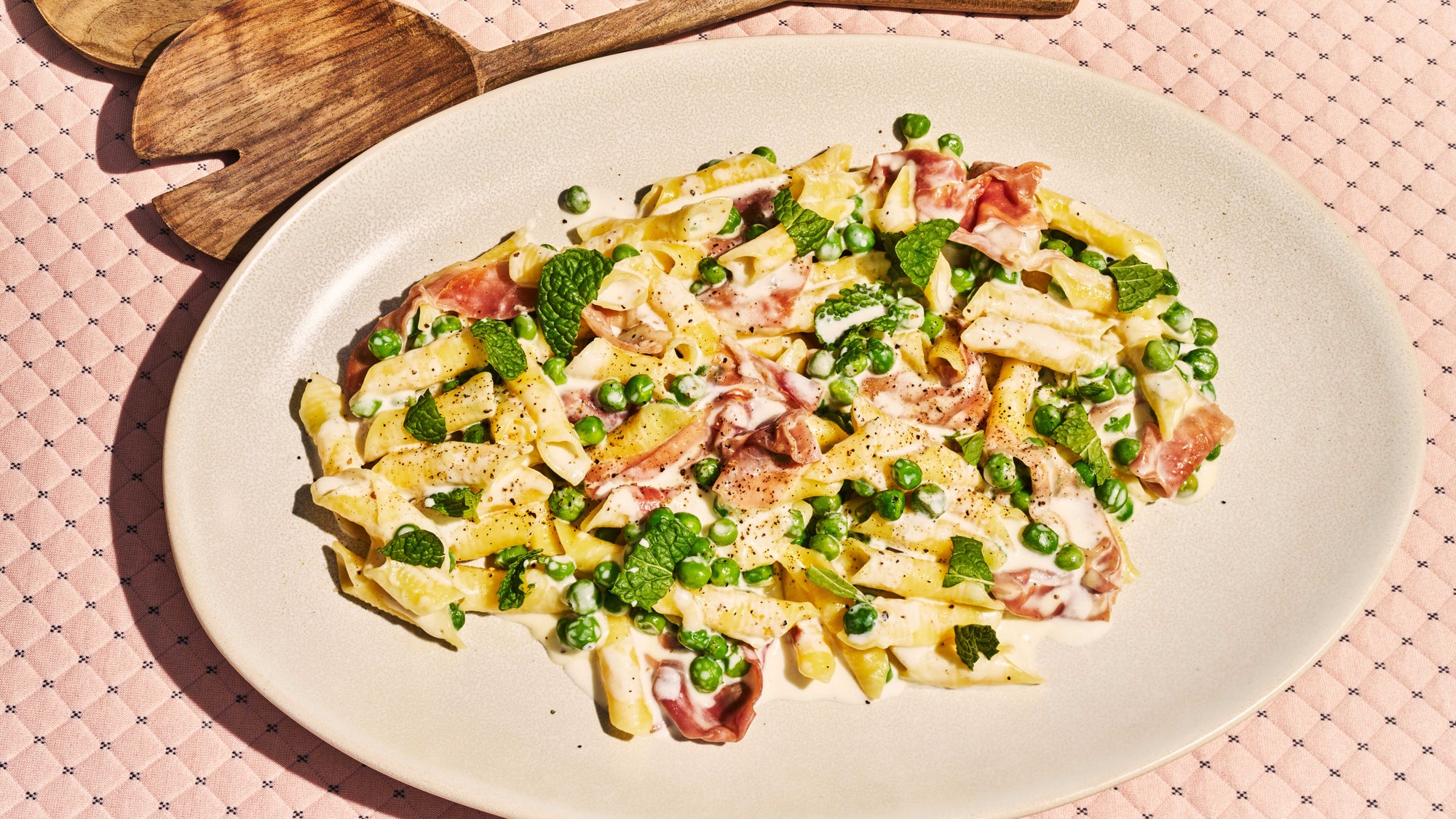 Tender, quill-shaped garganelli are tossed in a creamy sauce with candy peas and ribbons of Prosciutto di Parma that soften into the pasta, including delicate saltiness and meaty depth. Contemporary mint brings a springlike brightness, making each chunk flavorful, balanced, and full of life. Get the recipe >
