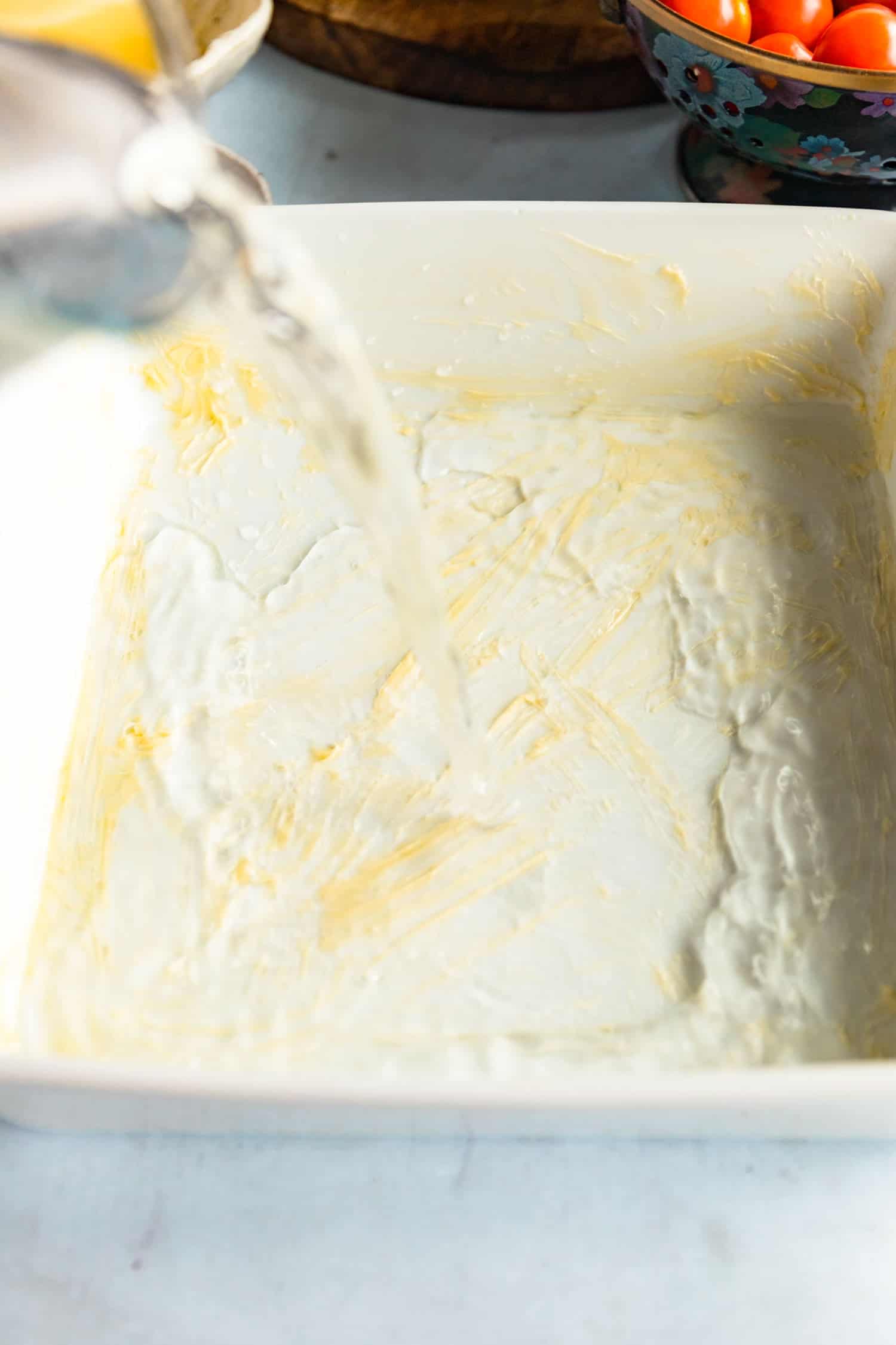 - Grease a 9×9-inch sq. baking pan generously with butter. Gently stir water, cornmeal, and salt straight within the greased pan. Fastidiously place the pan within the center rack of the oven, hopefully with out sloshing any water out of the pan. We’ll bake the polenta for 45 minutes. Take away from the oven and stir within the butter, cream, and parmesan cheese. Bake one other quarter-hour, or till the highest is dry and doesn’t jiggle a lot.