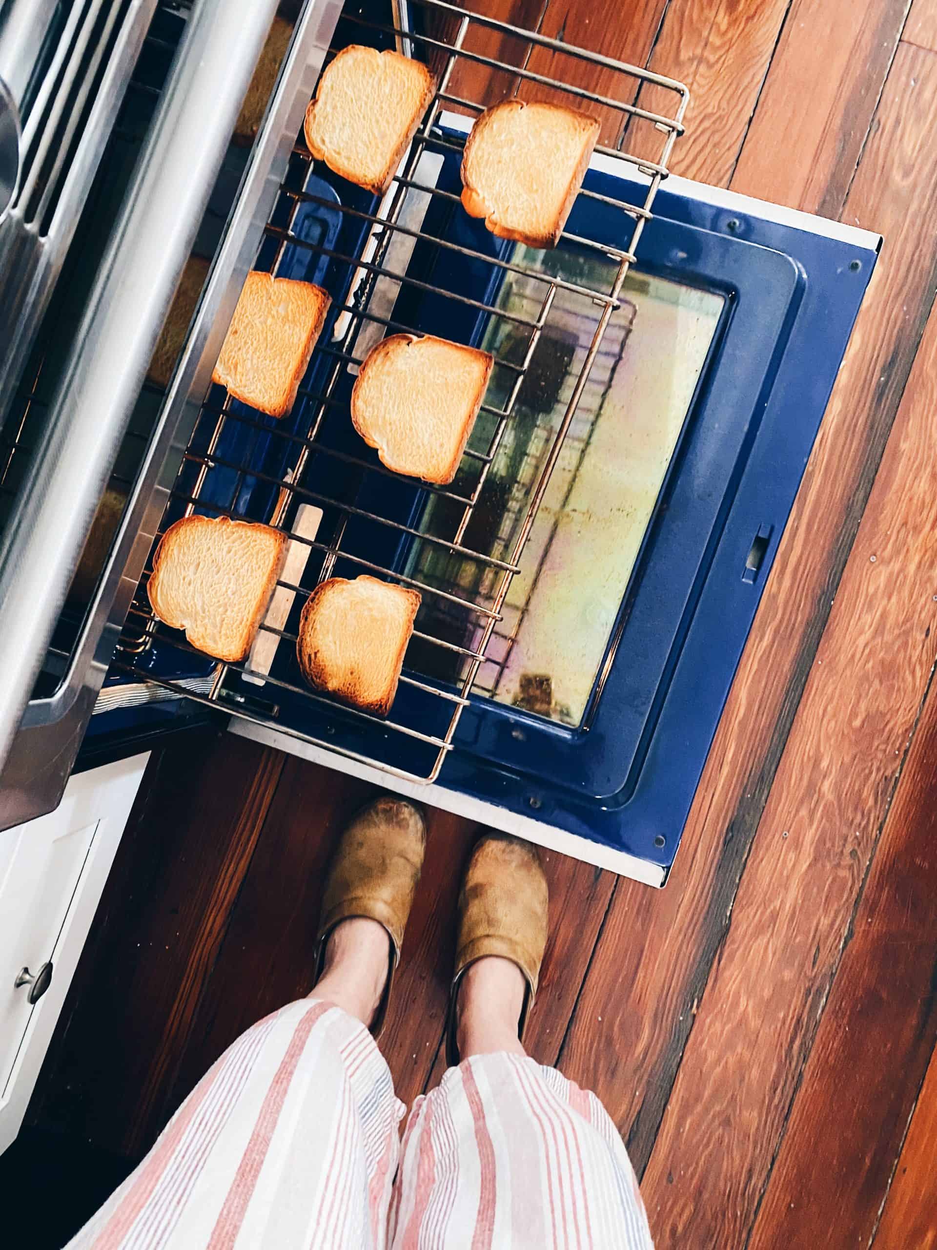 One simple, old skool method to take a look at your oven is with slices of plain ol’ white bread.  Kate McDermott, considered one of my favourite bakers, jogged my memory of this unimaginable baking hack and wow – the toast you’ll make!