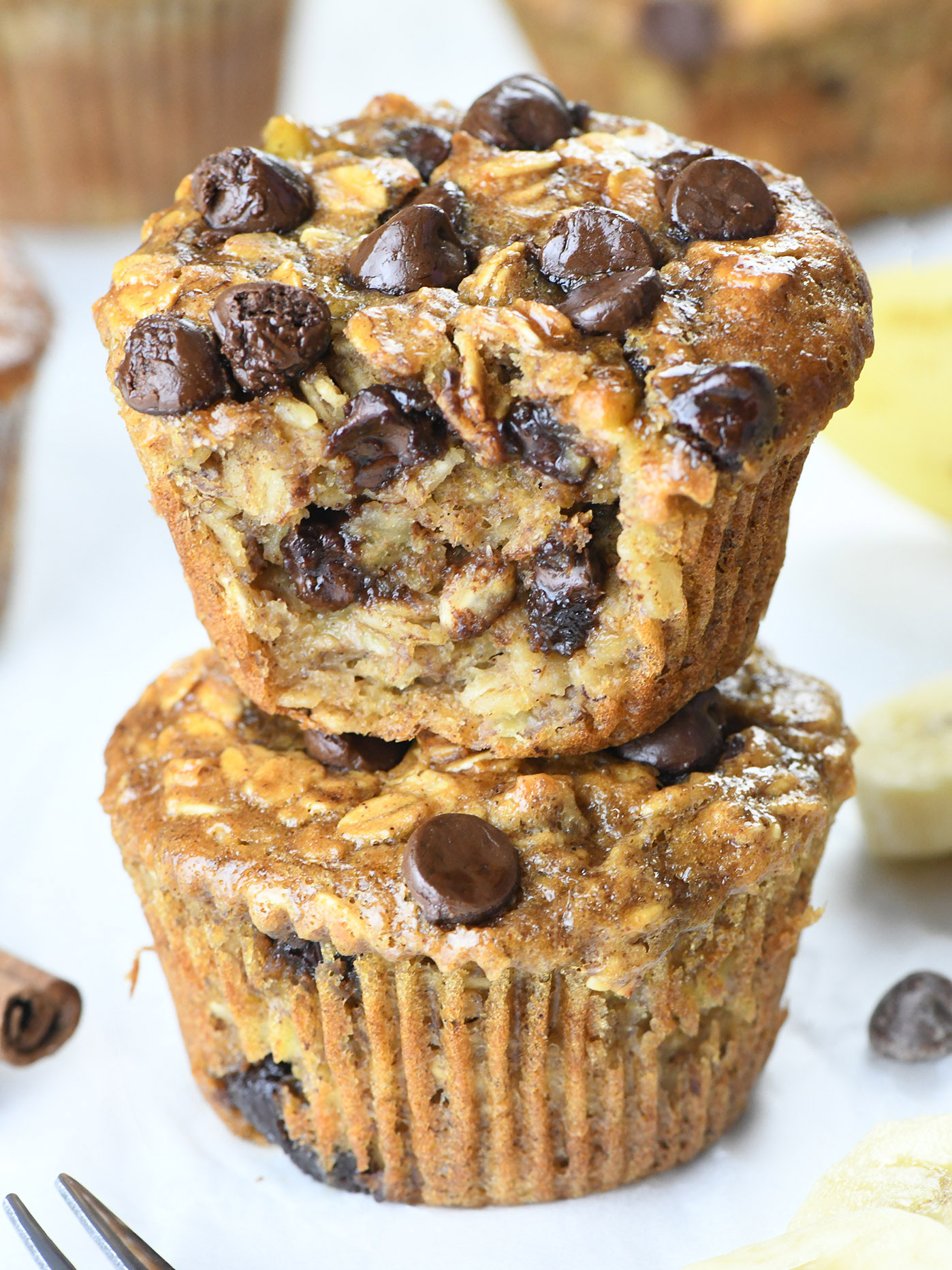 Stacked banana peanut butter baked oatmeal cups with chocolate chips and rolled oats