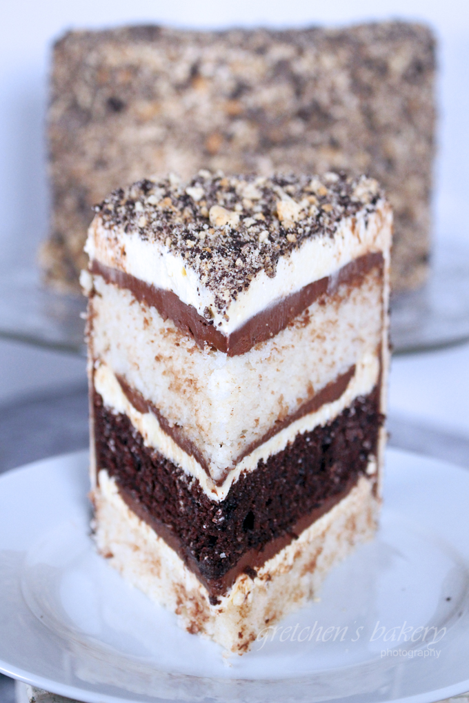 With a skinny layer of ganache and buttercream between every and miniature black and white cookies for every slice