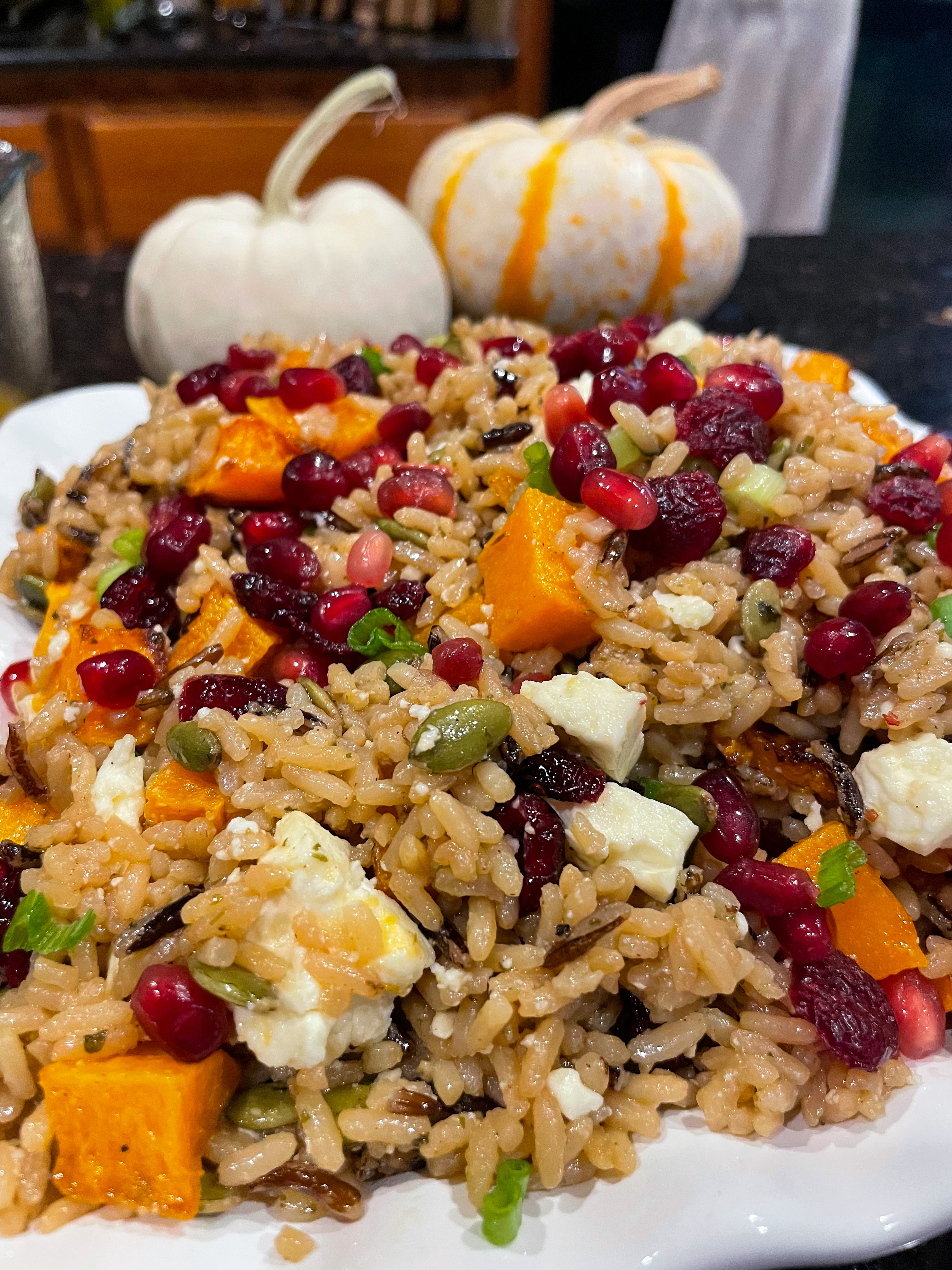- Mixed rice with roasted butternut squash, dried cranberries, pumpkin seeds, inexperienced onions, feta cheese, and pomegranate arils. Toss with about half the maple French dressing and refrigerate for no less than 2-4 hours. Add extra French dressing earlier than serving if desired.