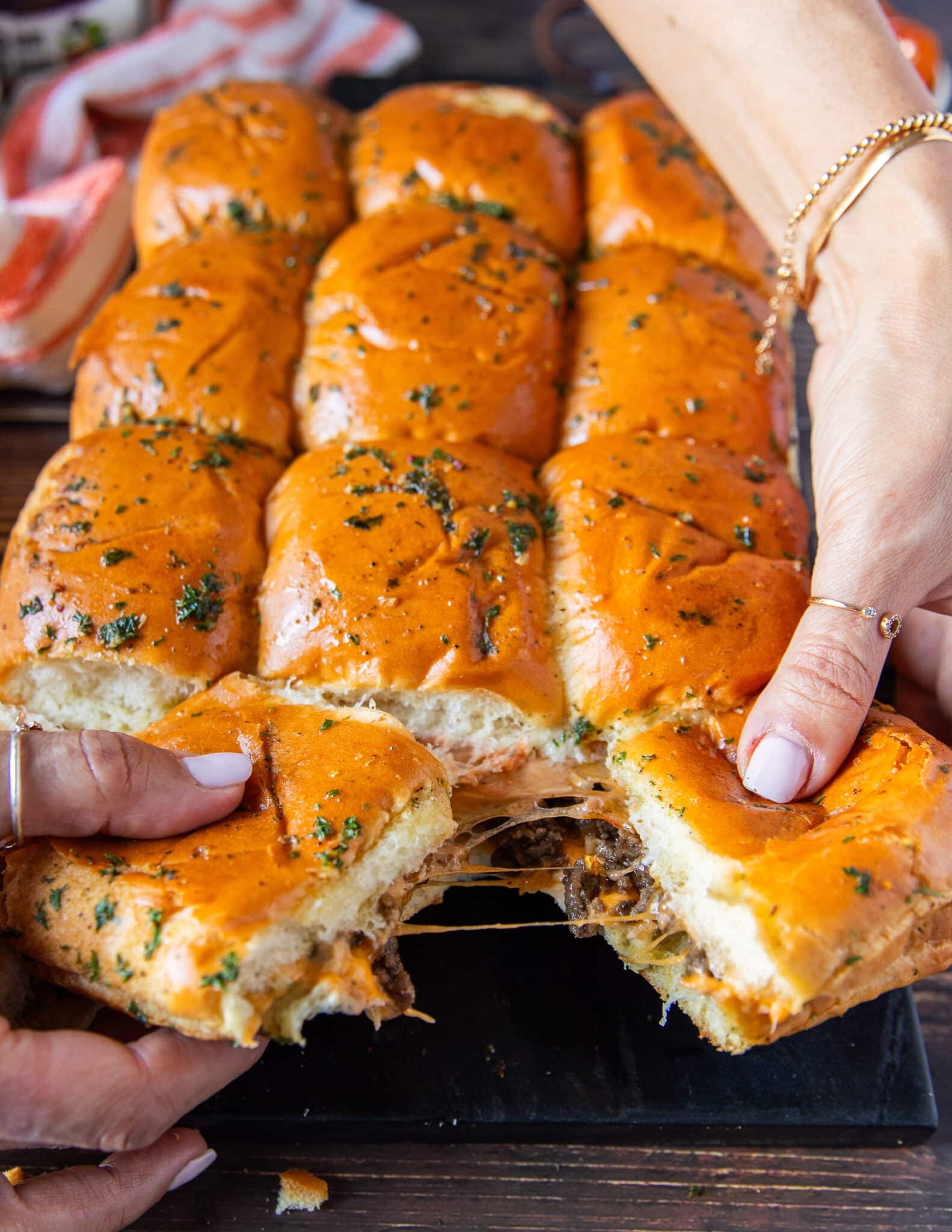 Sure completely! That’s the very best half really! You’ll put together the meat, assemble the sheet pan bread and brush the tops with the heb butter. Then cowl it with foil and set it apart. Half an hour earlier than serving, you’ll have to preheat the oven and heat up the sliders to soften the cheese.