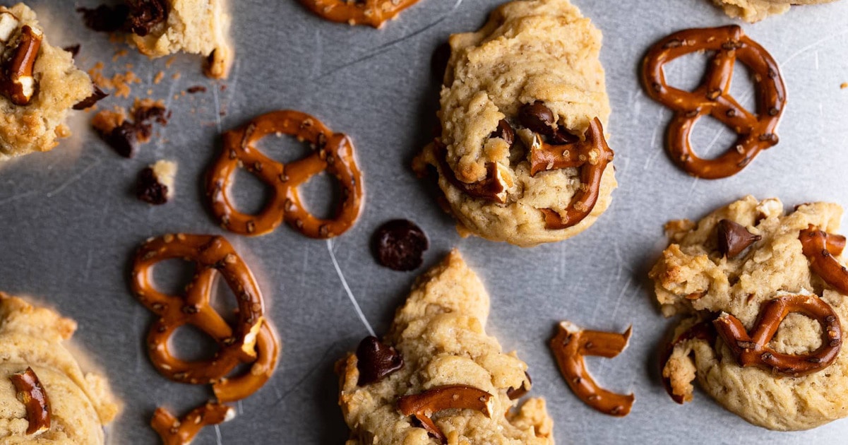 - Add flour, baking soda, salt, and cinnamon, and blend utilizing a rubber spatula. Fold in chocolate chips and pretzels.