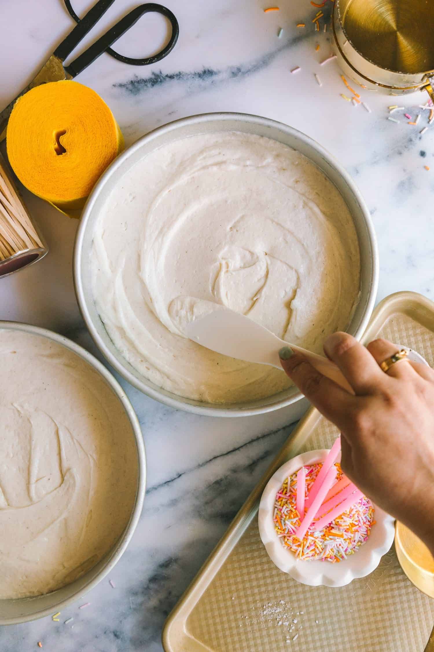 And lastly, for this traditional vanilla cake batter, fold within the egg whites in three batches. The primary batch will really feel clunky and awkward as a result of the feel of the 2 parts are so completely different however by the third batch of egg whites, the batter will really feel fluffy and aerated.