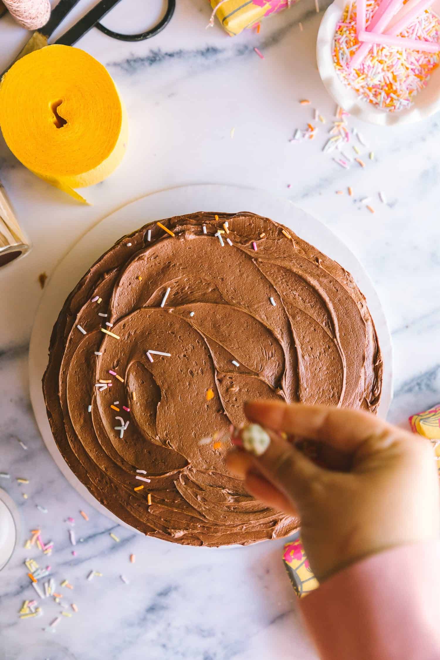High with the extra cake layer and canopy the whole floor of the cake with a skinny layer of mocha buttercream. The flavour is out of this world – you’ll need to eat this frosting by the spatulaful.