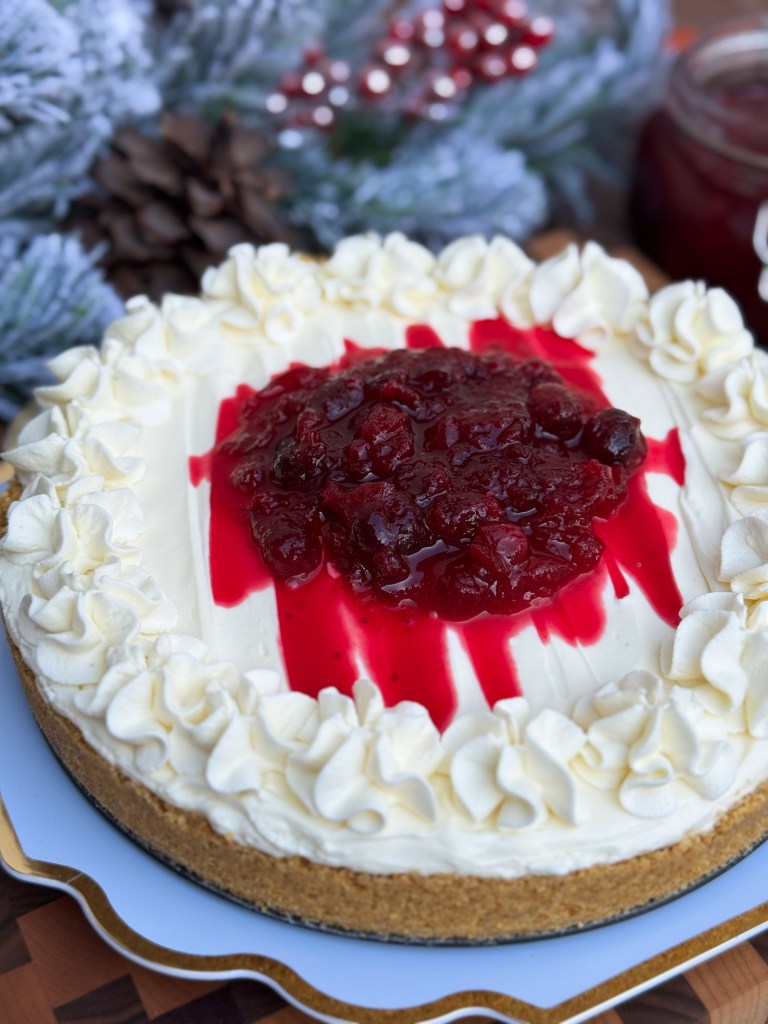 You possibly can completely make this dessert the day earlier than serving, even piping the whipping cream, however wait and spoon the cranberry sauce over the cheesecake simply earlier than serving for the prettiest dessert.