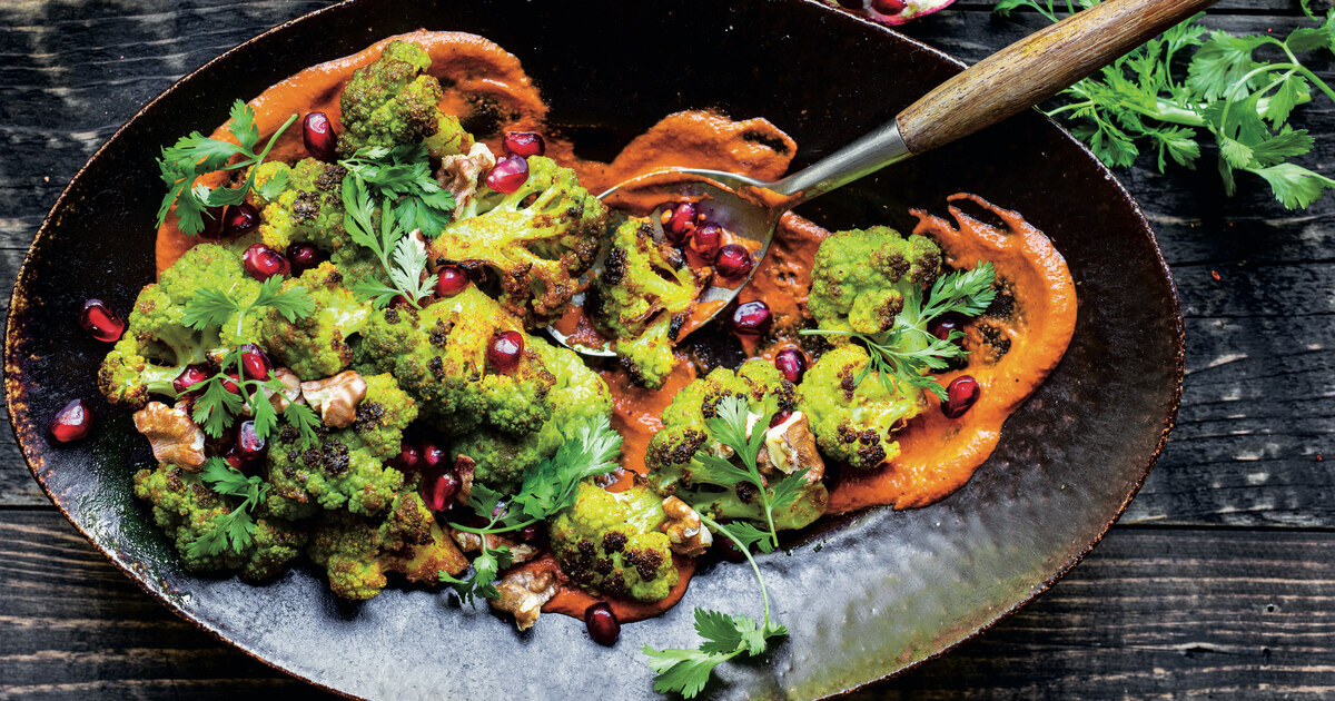 - In a big bowl, toss cauliflower with cilantro, pomegranate seeds, and walnuts. Spoon cauliflower combination onto muhammara and serve.