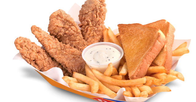 Dairy Queen’s Rooster Strip Basket contains 4 crispy-fried seasoned chicken hen strips served with French fries, Texas toast, and your selection of dipping sauce.