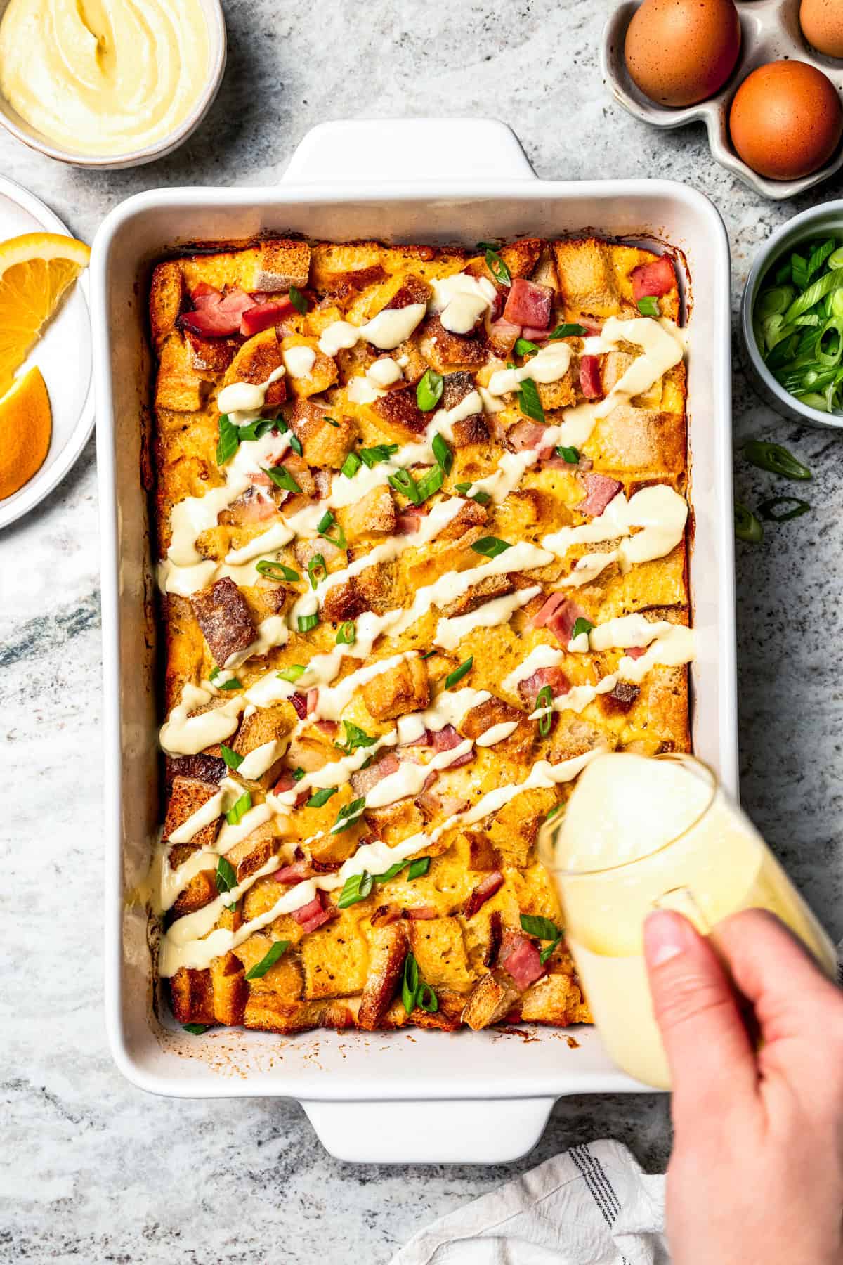 - Pour the sauce over the casserole. You may pour the sauce over the entire baked casserole, or drizzle the hollandaise over particular person slices. Sprinkle on some inexperienced onions or chives in case you’d like, and serve.