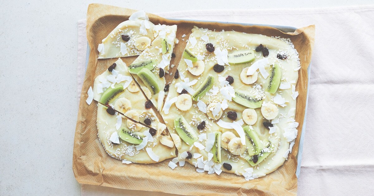 The tropical flavors of banana, coconut, and kiwi add great taste and texture to this bark from the Simple Speedy Vegan cookbook, however be happy to swap in seasonal berries, cherries, chopped nuts, or chocolate chips.