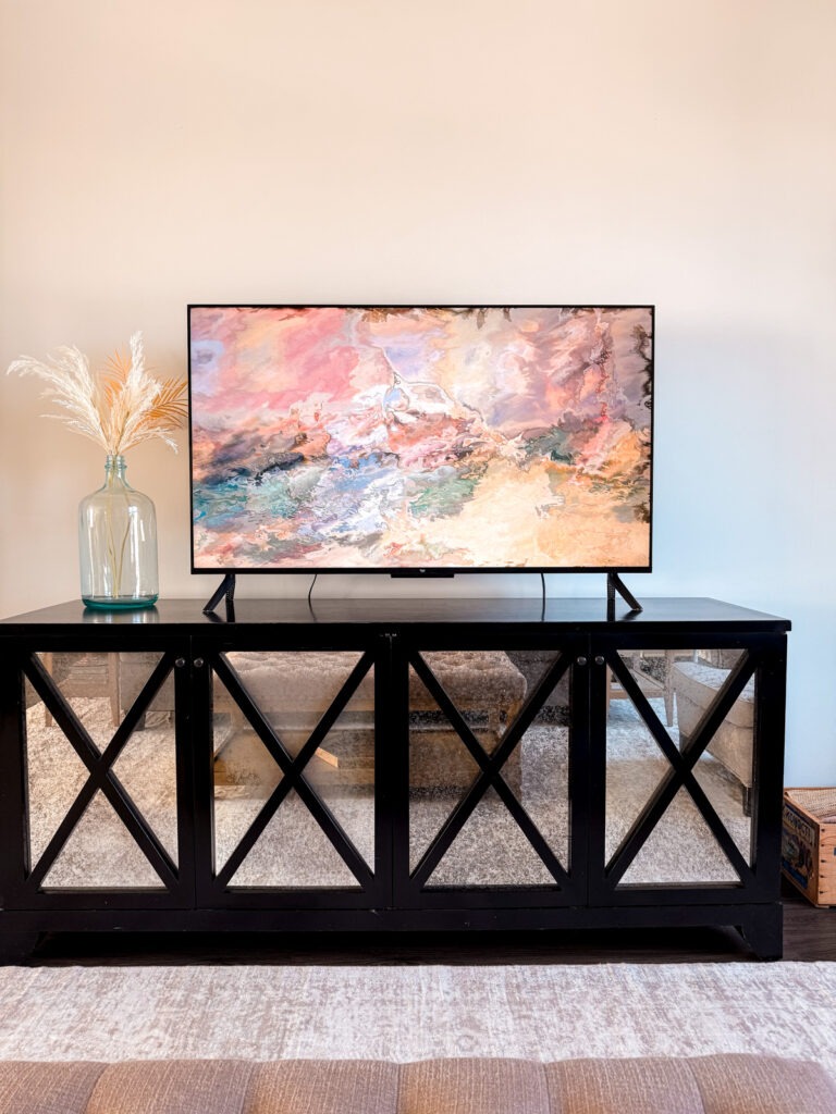 It additionally activates robotically once you stroll into the room and powers down once you depart, which helps save vitality. You’ll be able to mount it like a body on the wall, however mine is completely joyful simply resting on the console. And naturally it’s a complete good TV with all of the apps and issues.