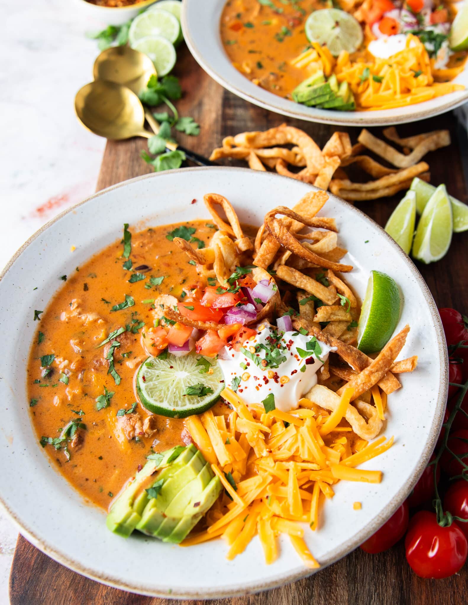 two bowls of chicken taco soup topped with tortilla chips, avocados, sour cream, and lime wedges