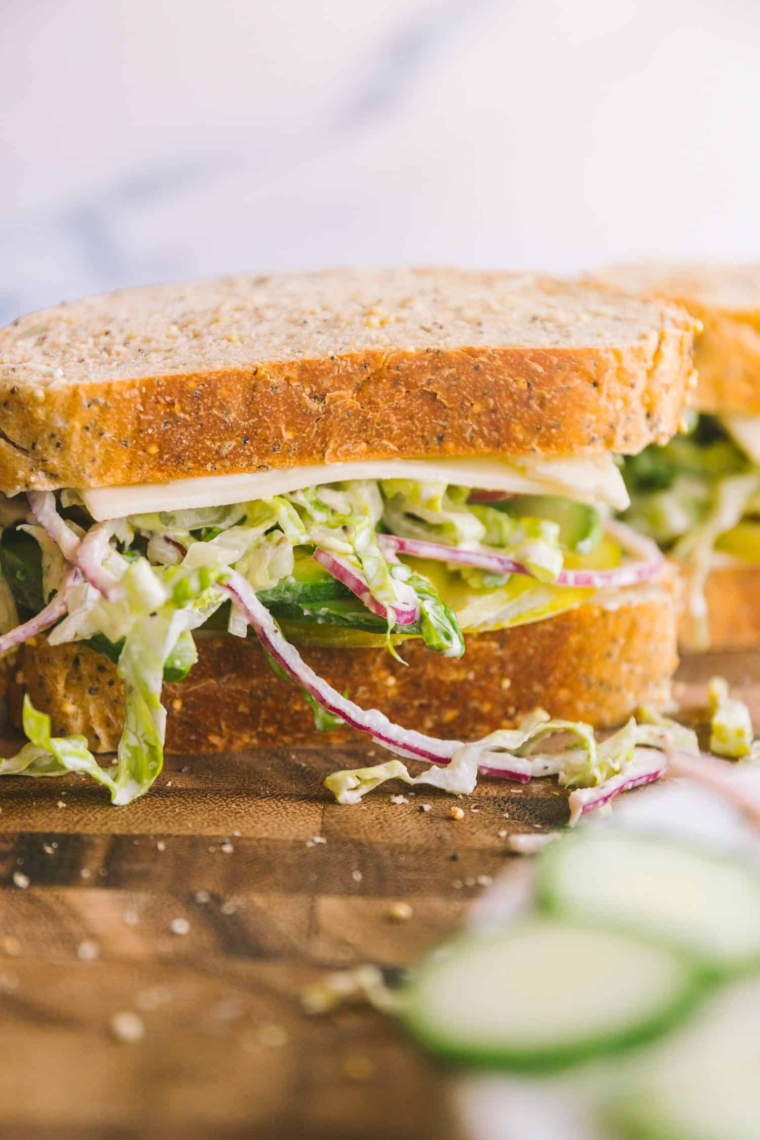 - To make the sandwiches, pile bread excessive utilizing your coronary heart and stomach as your measuring instrument. I prefer to flippantly toast thick slices of seeded bread. Unfold every slice flippantly with mayonnaise. Place a chunk of cheese on every slice of bread. Layer one slice of bread with avocado slices, cucumber and tomato slices. Prime with a heaping mound of the ready iceberg lettuce salad and high with the opposite slice of bread. Wrap tightly in parchment paper and refrigerate till able to serve. Slice in half (by way of the paper) to take pleasure in.