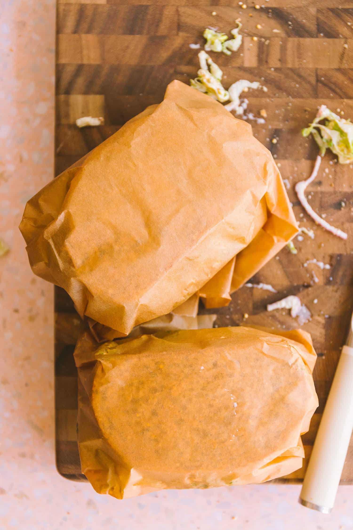 Let’s be trustworthy, this sandwich is messy. Seize various napkins. To comprise all of that goodness, wrap every sandwich in a chunk of parchment paper and refrigerate till they’re served. Use a serrated knife to slice by way of the paper and the sandwich simply earlier than serving.