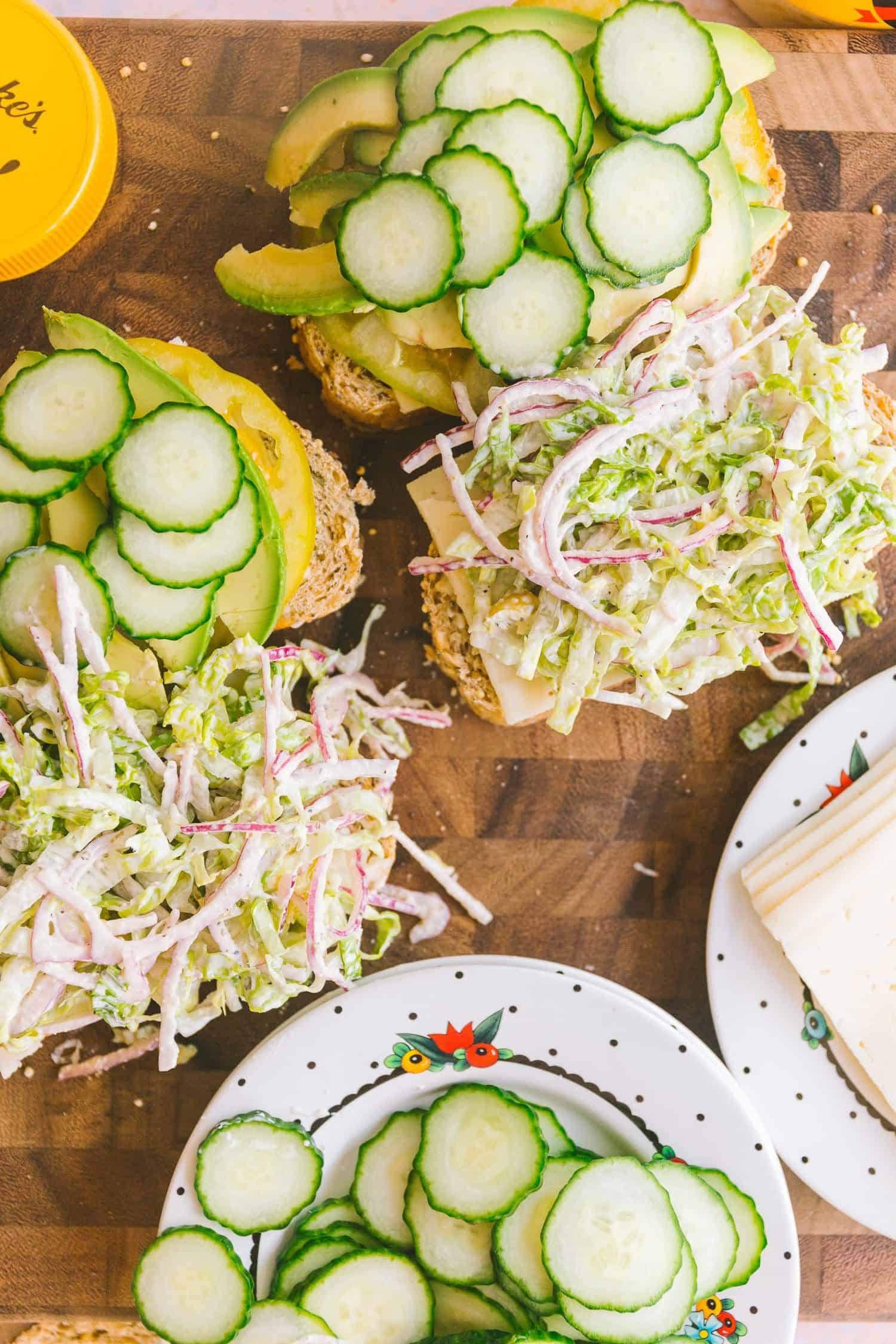 Unfold the thick slices of bread with mayo and layer with sliced cheese, tomato slices, avocado, cucumber, and the salad we made.
