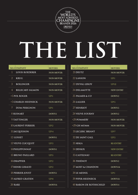 Whereas there’s loads of flux within the now 40-strong checklist, Louis Roederer’s constant success is mirrored throughout the highest 4, which stays unchanged since 2024.