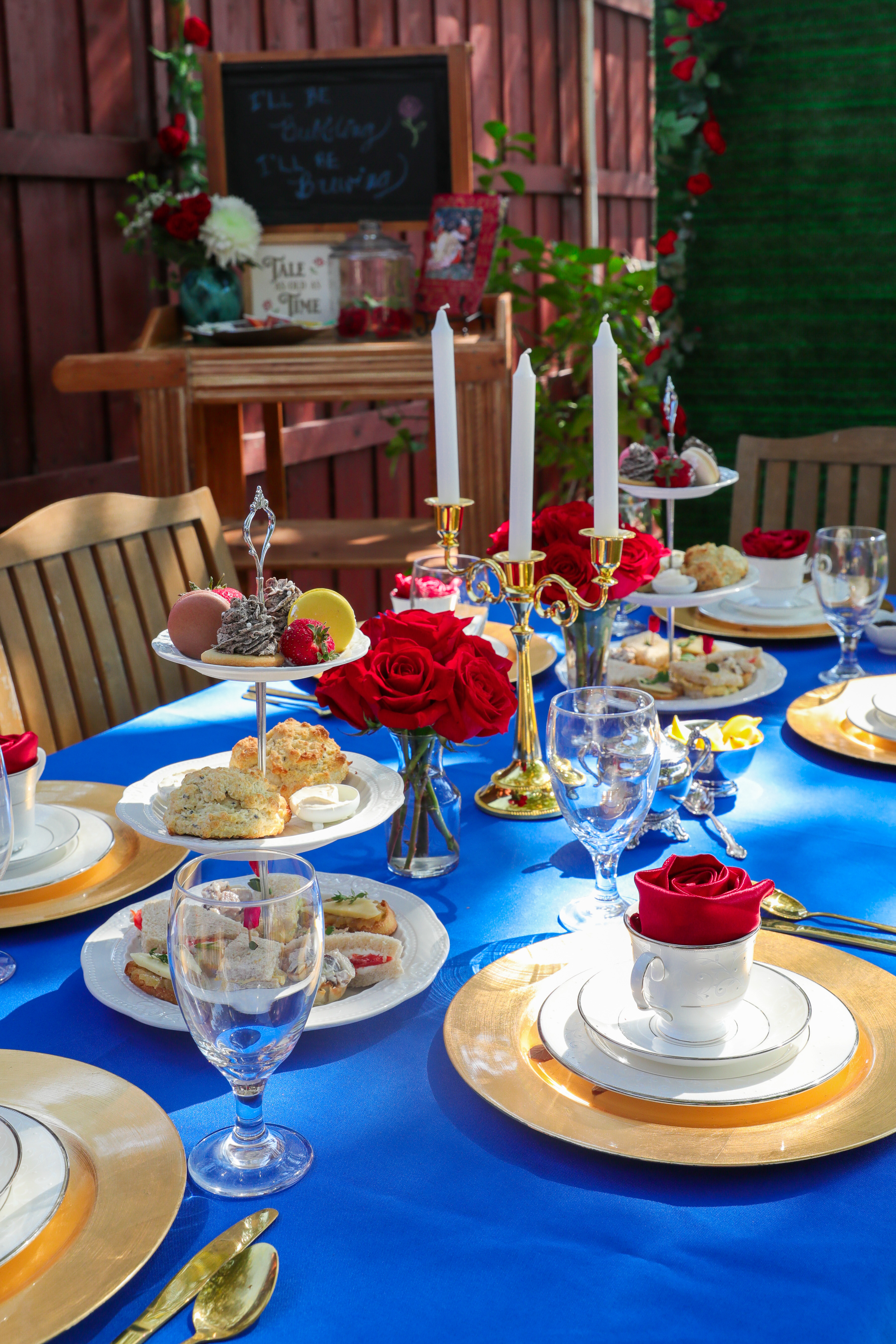 This desk seems to be very completely different from my authentic Magnificence and the Beast ceremonial dinner and that was type of the purpose! For my Magnificence and the Beast Tea occasion, I used to be impressed by Beast’s outfit through the well-known ballroom scene. I styled the desk with a royal blue tablecloth and gold candelabra centerpiece (Lumiere, after all!) with small bouquets of crimson roses on both aspect and two 3-tiered stands. Easy and chic! Not like my dinner events, the meals after all was served unexpectedly and was due to this fact the true centerpiece.