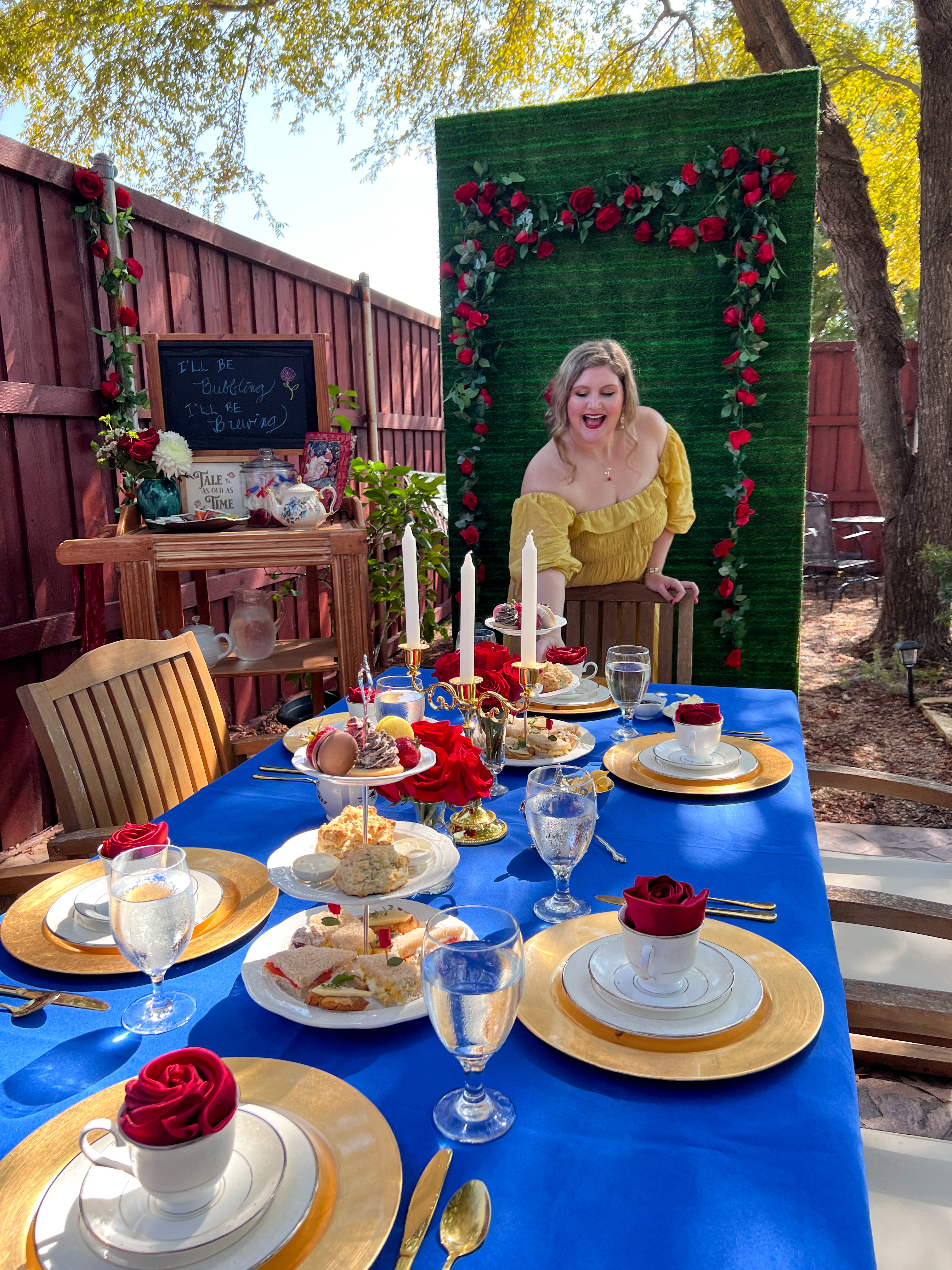 I hosted my Magnificence and the Beast tea occasion in my backyard with a totally completely different look than my ceremonial dinner. (If you happen to’re searching for beef ragout and cheese soufflé, click on right here.) The principle decor gadgets had been my epic rose wall (discover ways to construct your individual right here) and my tea cart plus some rose garlands and naturally, all of my actual roses.