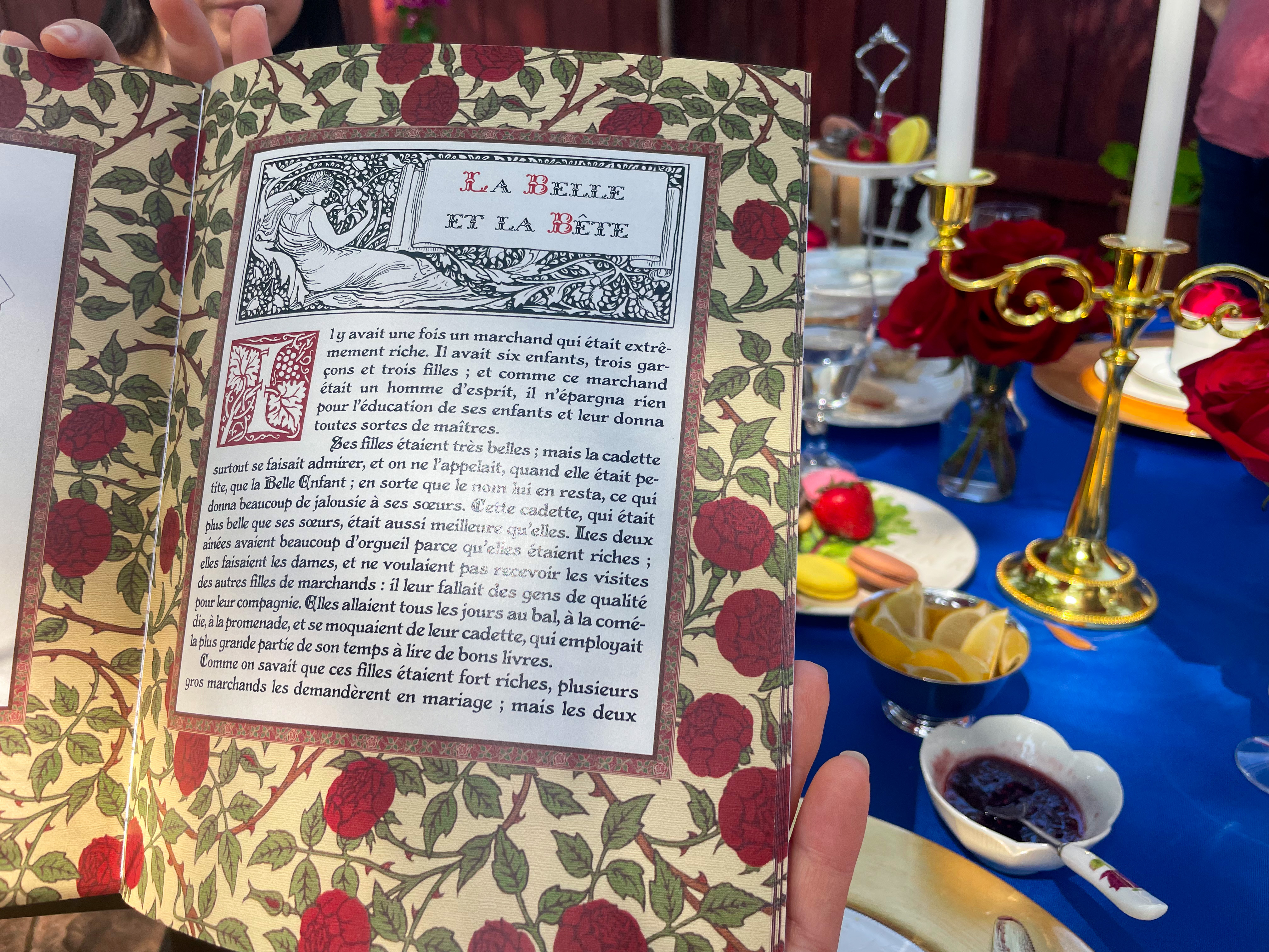 I additionally had a crimson rose bouquet and a superbly illustrated copy of the unique French Magnificence and the Beast fairytale adorning the bar cart. It seems, a number of of my company communicate French and we had been handled to a studying of the fairytale by Yisha!