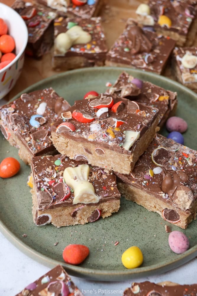 A easy six ingredient and no-bake traybake that’s good for all ages. With a easy biscuit base, of three elements and your favorite easter treats, topped with a chocolate of selection and some extra easter candies for good measure