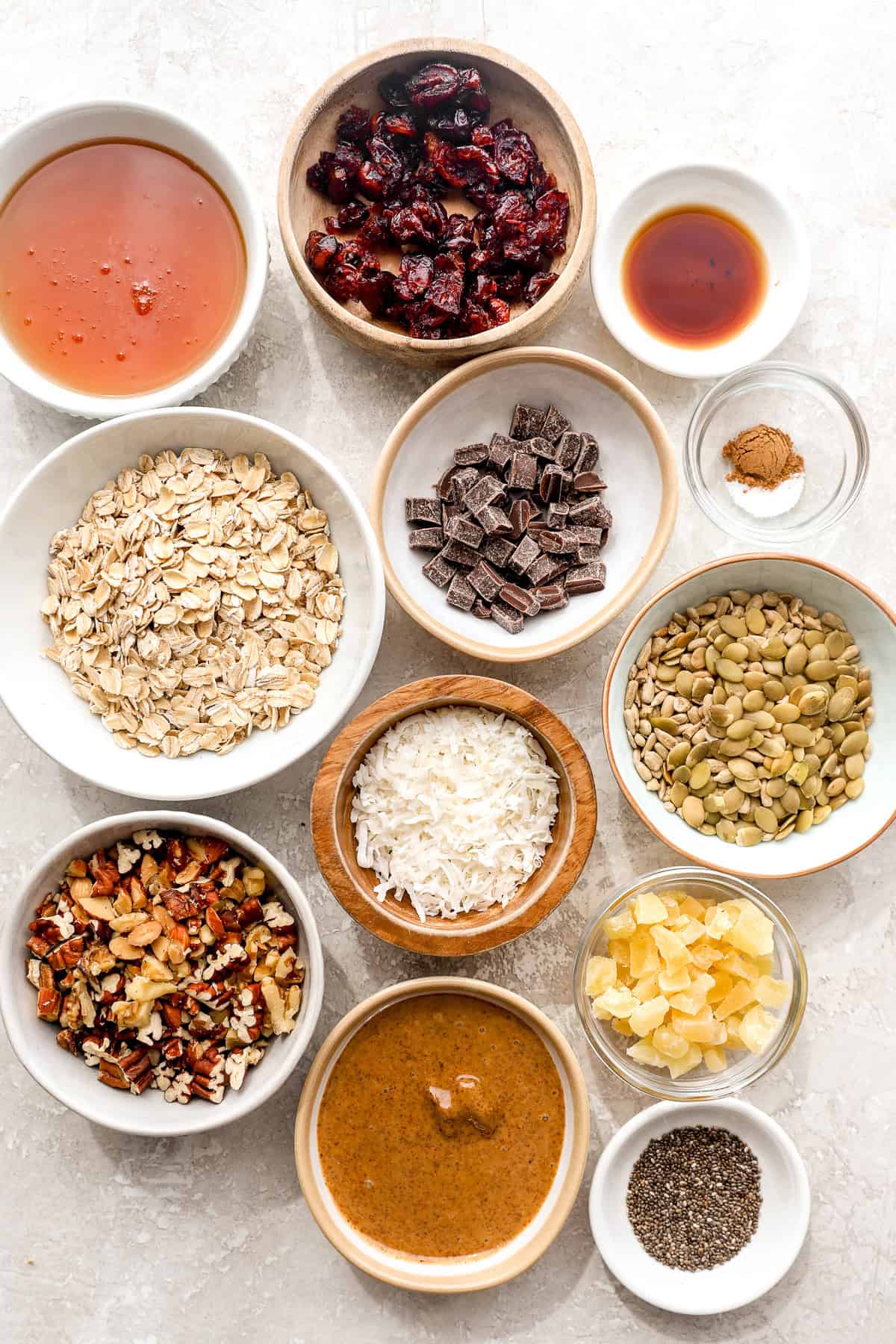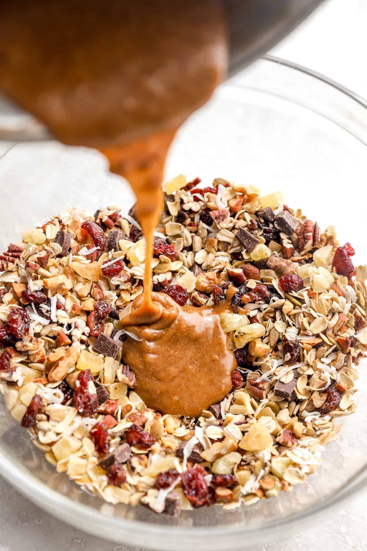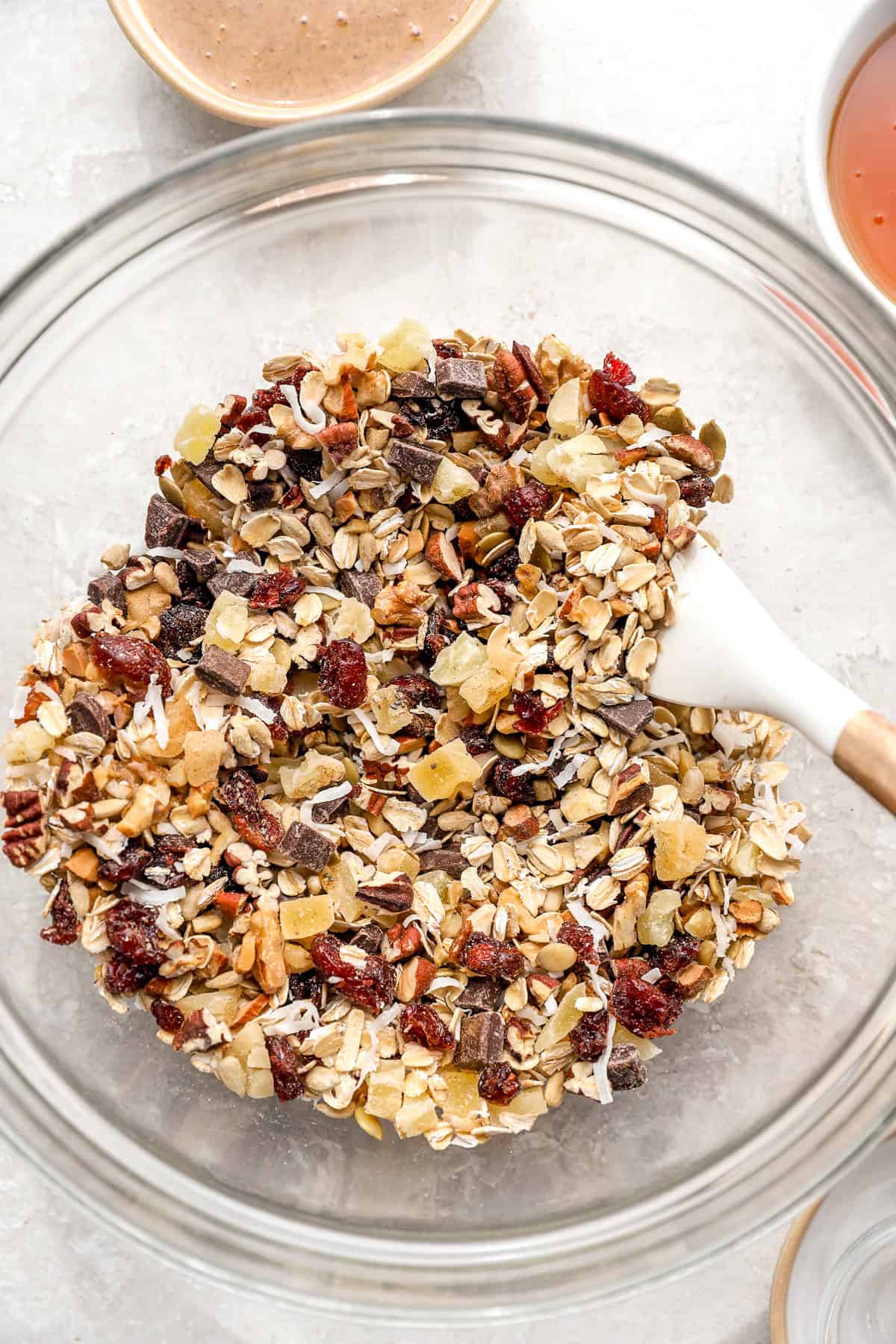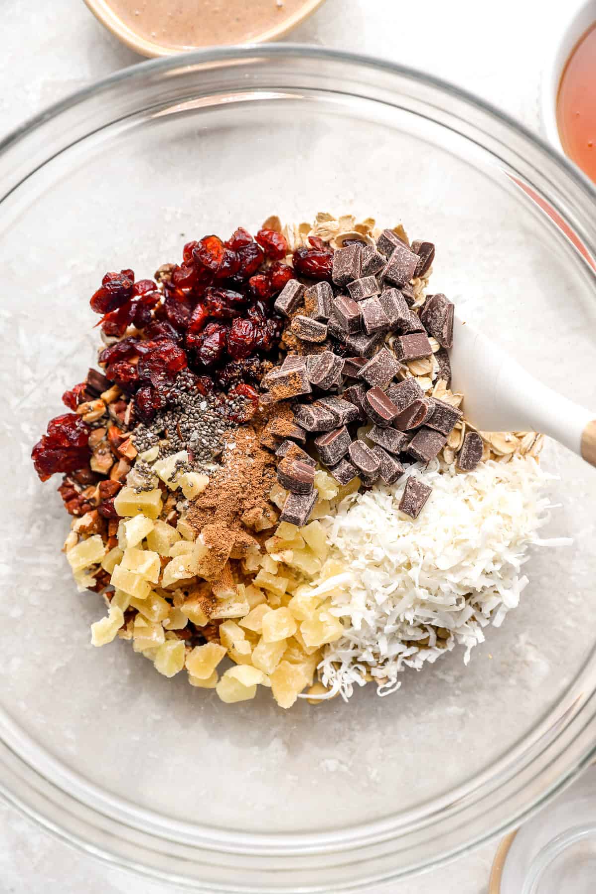 - Dried fruit (cranberries + pineapple): That is the place you get little bursts of sweetness and chew. Use no matter dried fruit you like—raisins, cherries, apricots, or blueberries all work.