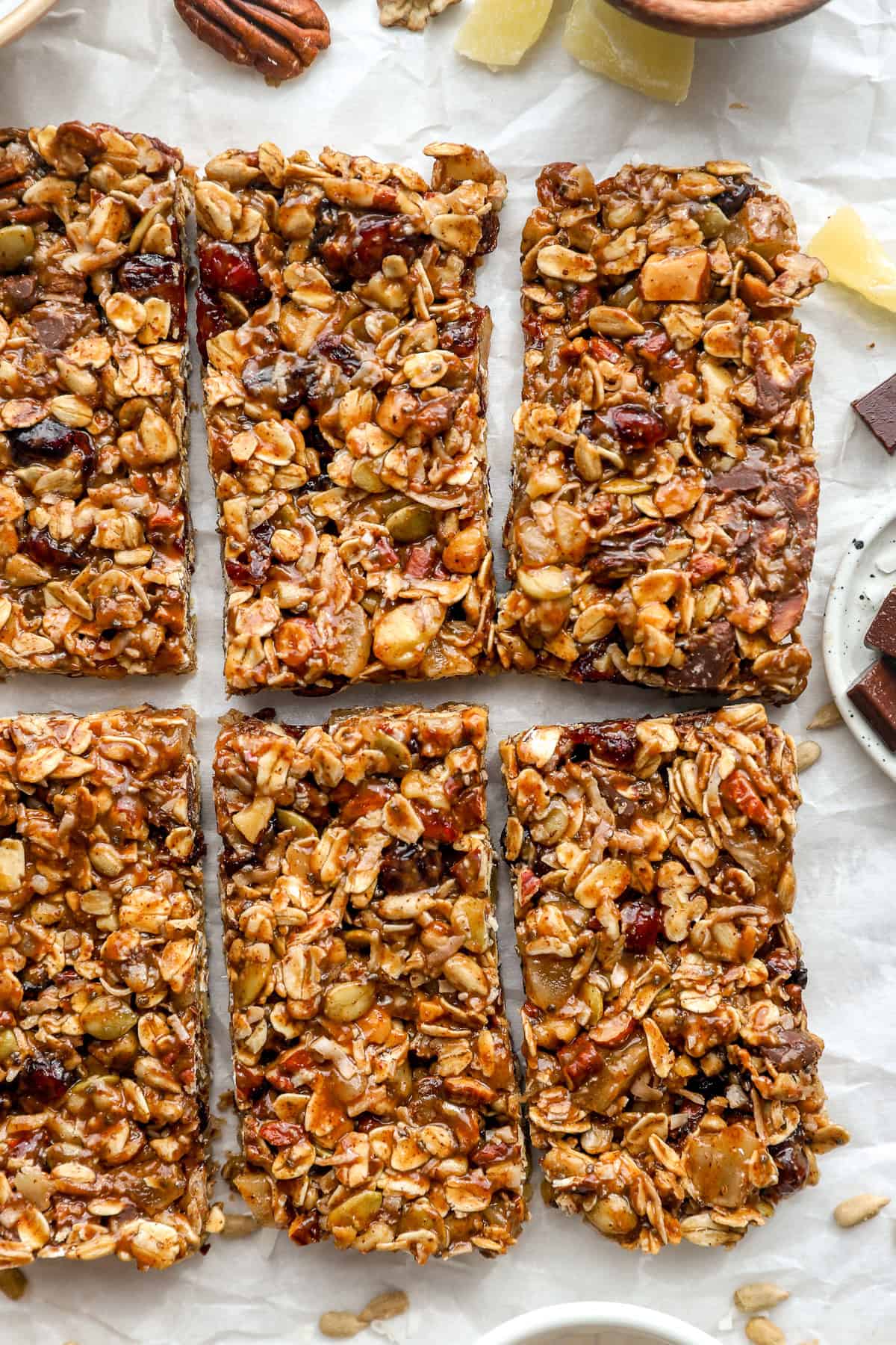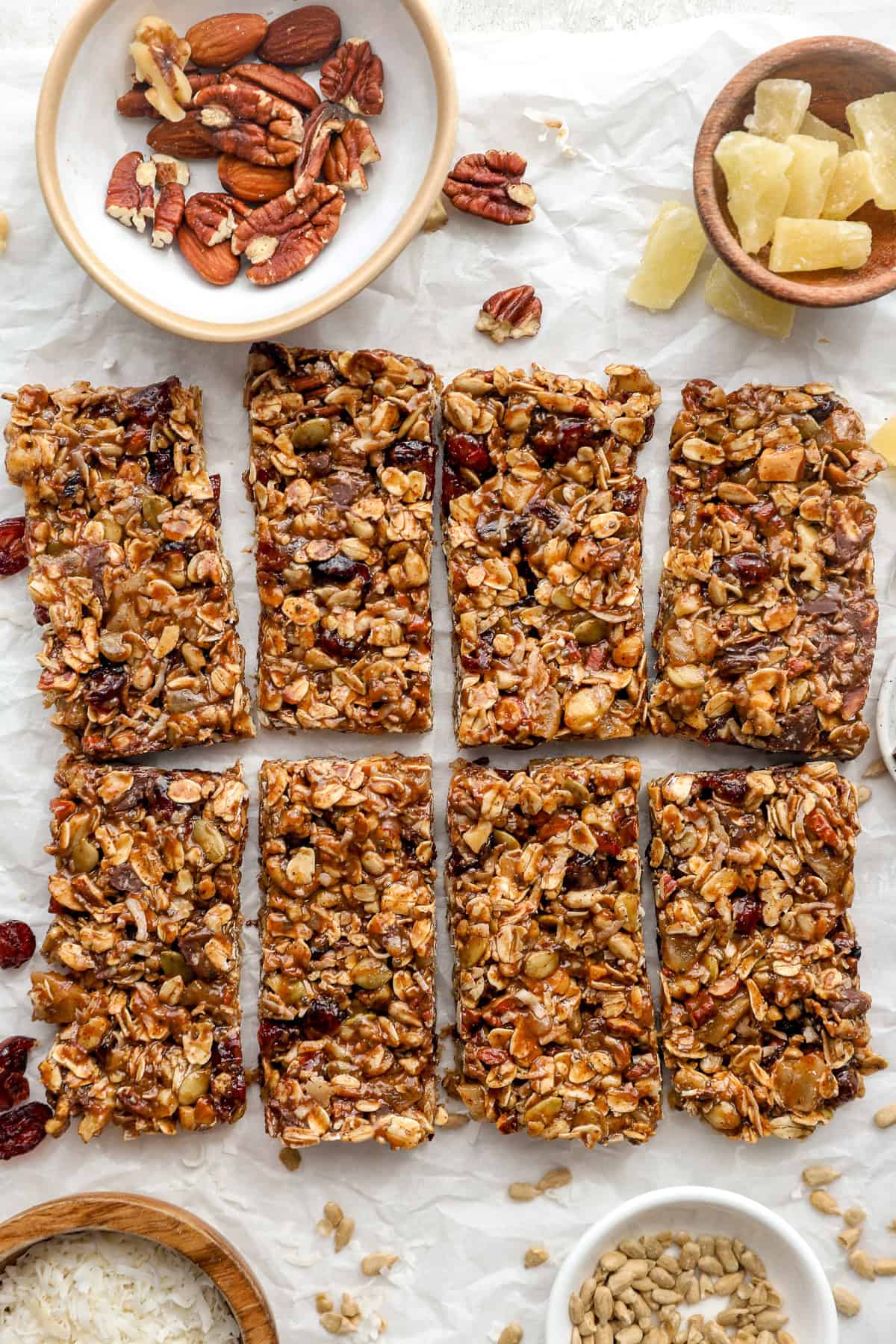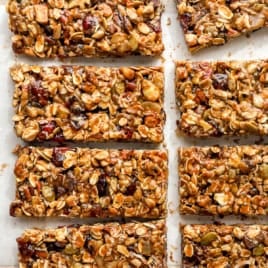 - Gluten-free oats: Oats assist bind every part collectively and provides granola bars their traditional chewy texture. For a paleo possibility, you’ll be able to depart these out and enhance the nuts/seeds barely.
