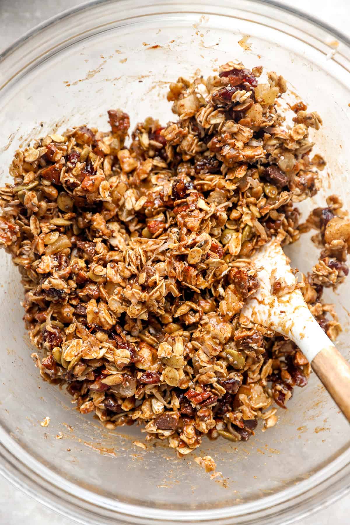 2. Combine the dry components: In a big bowl, mix the nuts, seeds, oats, chia seeds, coconut, dried fruit, chocolate, and seasonings.
