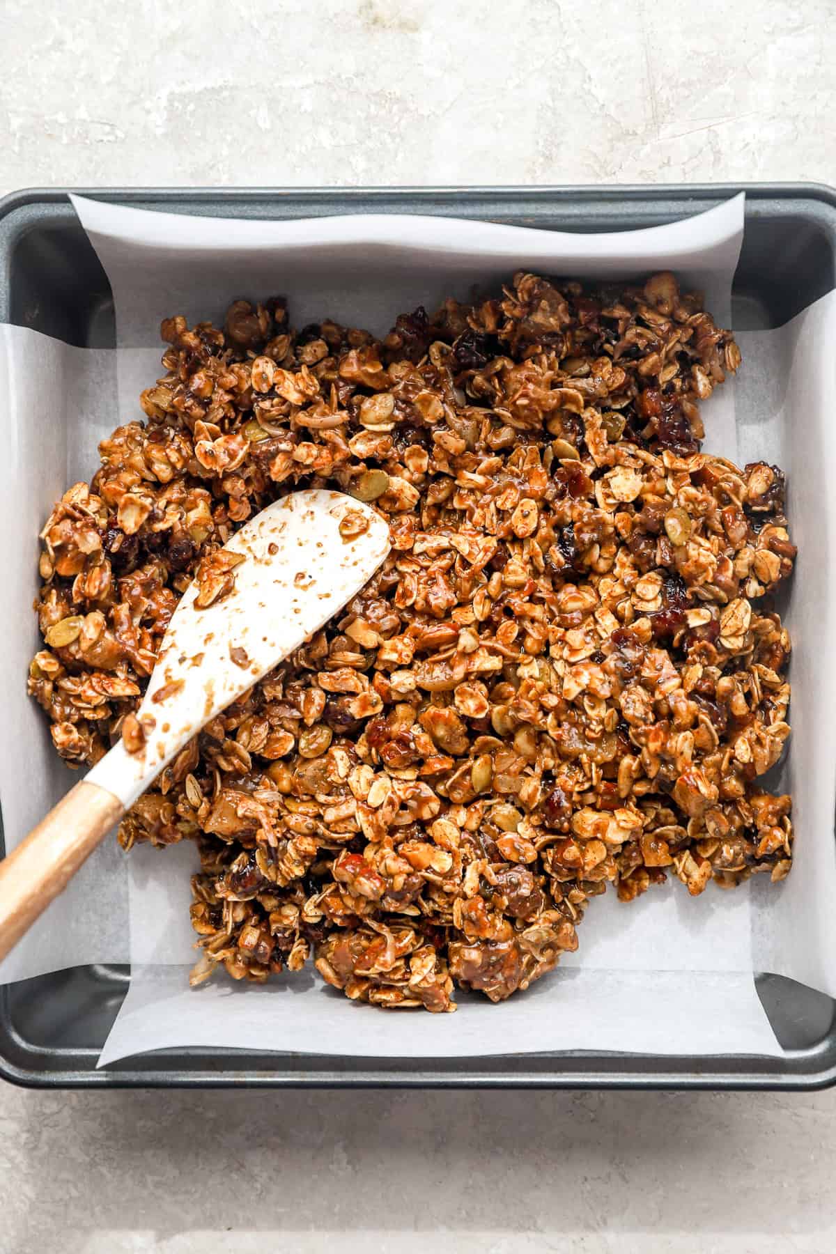 5. Press and set: Switch to a parchment paper-lined pan and press firmly into a fair layer—this step is essential for bars that maintain collectively.
