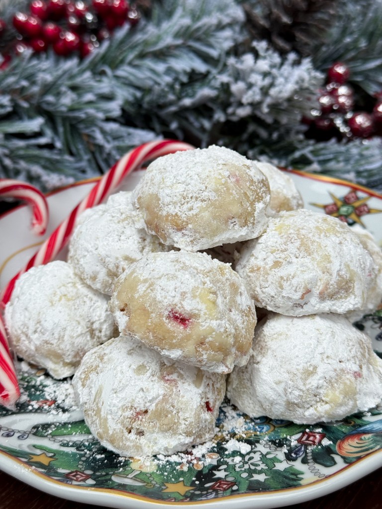 In search of a simple Christmas cookie that doesn’t require a mixer? This quaint batter comes along with only a picket spoon! How cute are these snow white Peppermint Snowball Cookies for a cookie platter?