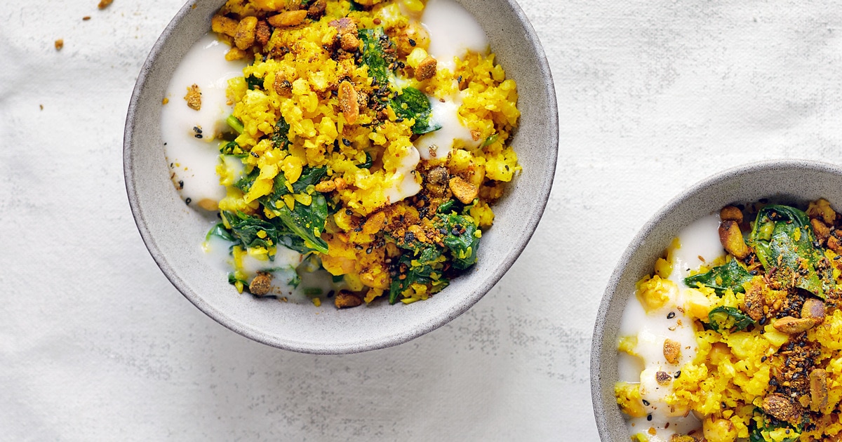 This totally comforting dish from the Good Vegetation cookbook gained’t simply feed your stomach—it provides brain-boosting elements comparable to turmeric and spinach, and gut-healing probiotics from wealthy coconut yogurt. Win-win!