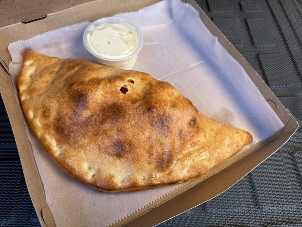 Subsequent up was the new wing stromboli. I’ll admit, I used to be anticipating the standard rolled-up, cylindrical stromboli, however this one got here out in a half-moon form that regarded much more like a calzone. In fact, there’s no ricotta right here, so calzone purists can calm down — this was firmly in stromboli territory.