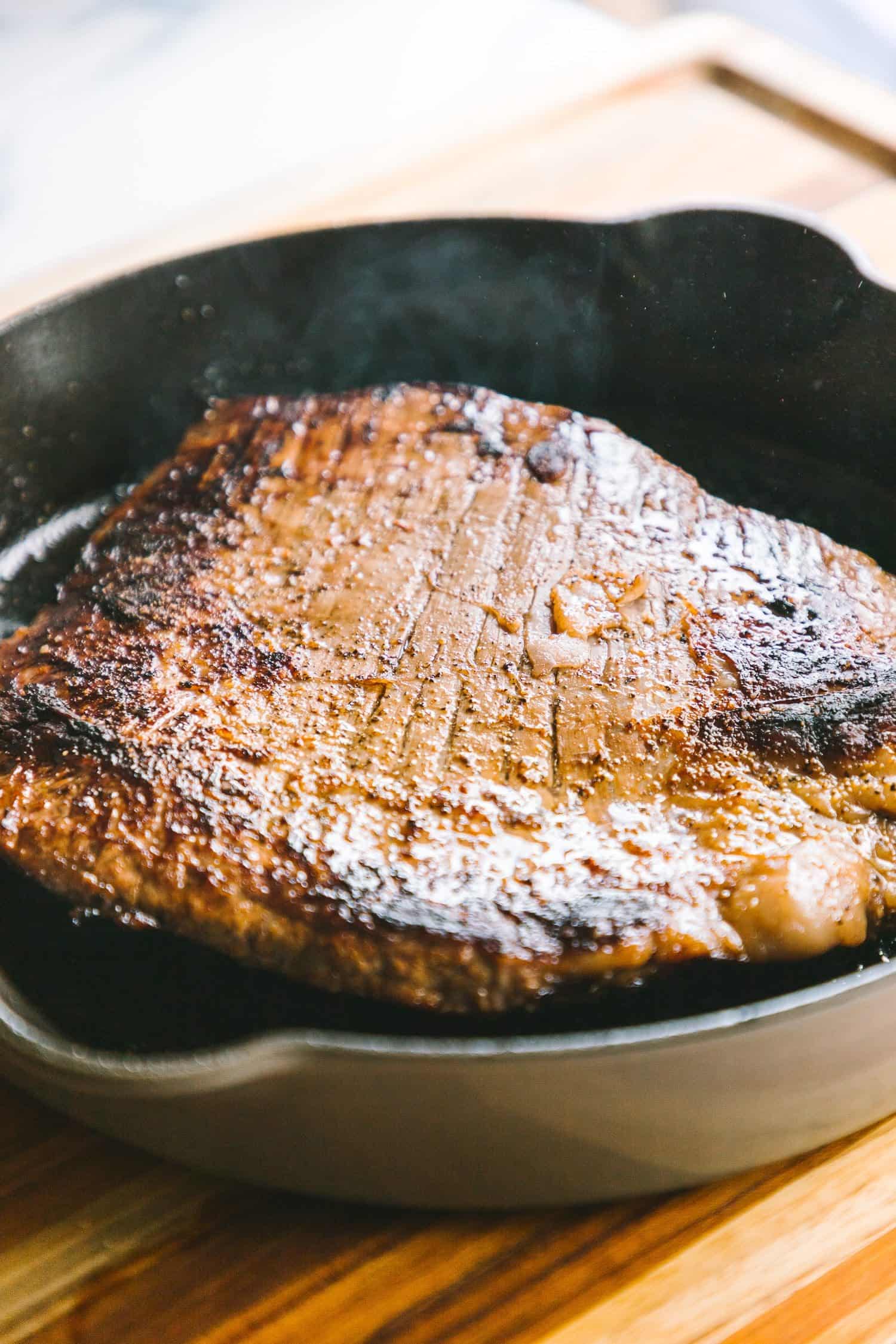 Take away the steak from the marinade and convey it nearer to room temperature earlier than cooking. I go away the steak on the counter for half-hour. Simply earlier than searing in a hothothot forged iron, pat the steak dry with a paper towel. A dry steak will develop a pleasant crust within the sizzling pan moderately than steaming the floor of the steak.