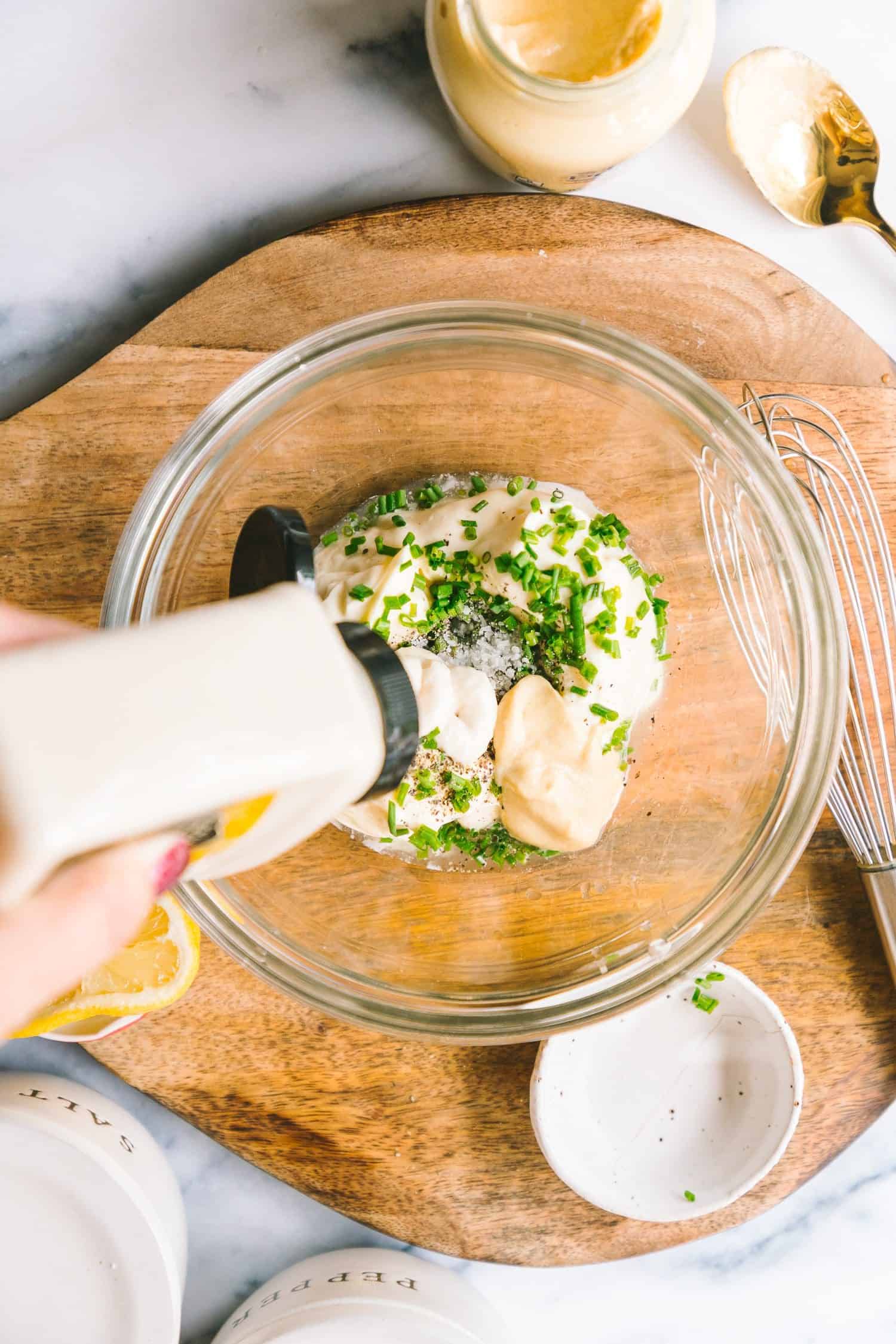 • spicy horseradish mayo that features: Duke’s mayo (and Duke’s mayo solely), ready horseradish, chives, lemon, salt and pepper.