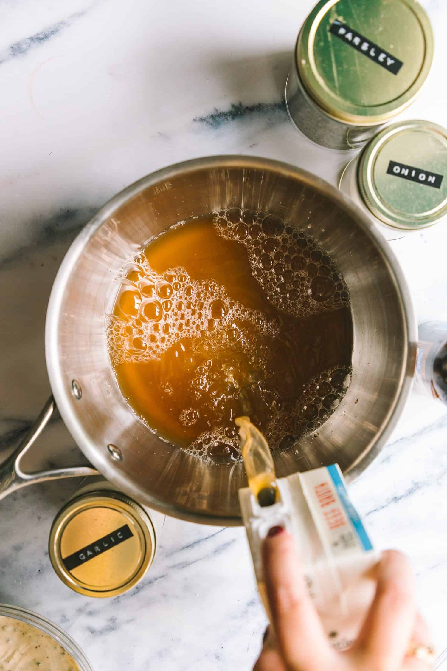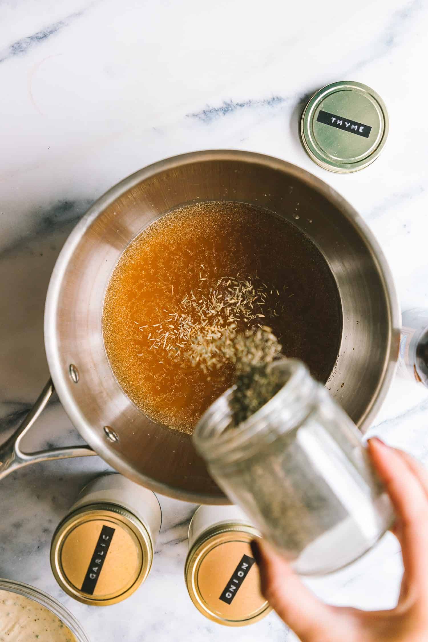 Pour beef broth right into a saucepan and warmth gently with onion powder, garlic powder, and some dried herbs. Add a bay leaf for further credit score.