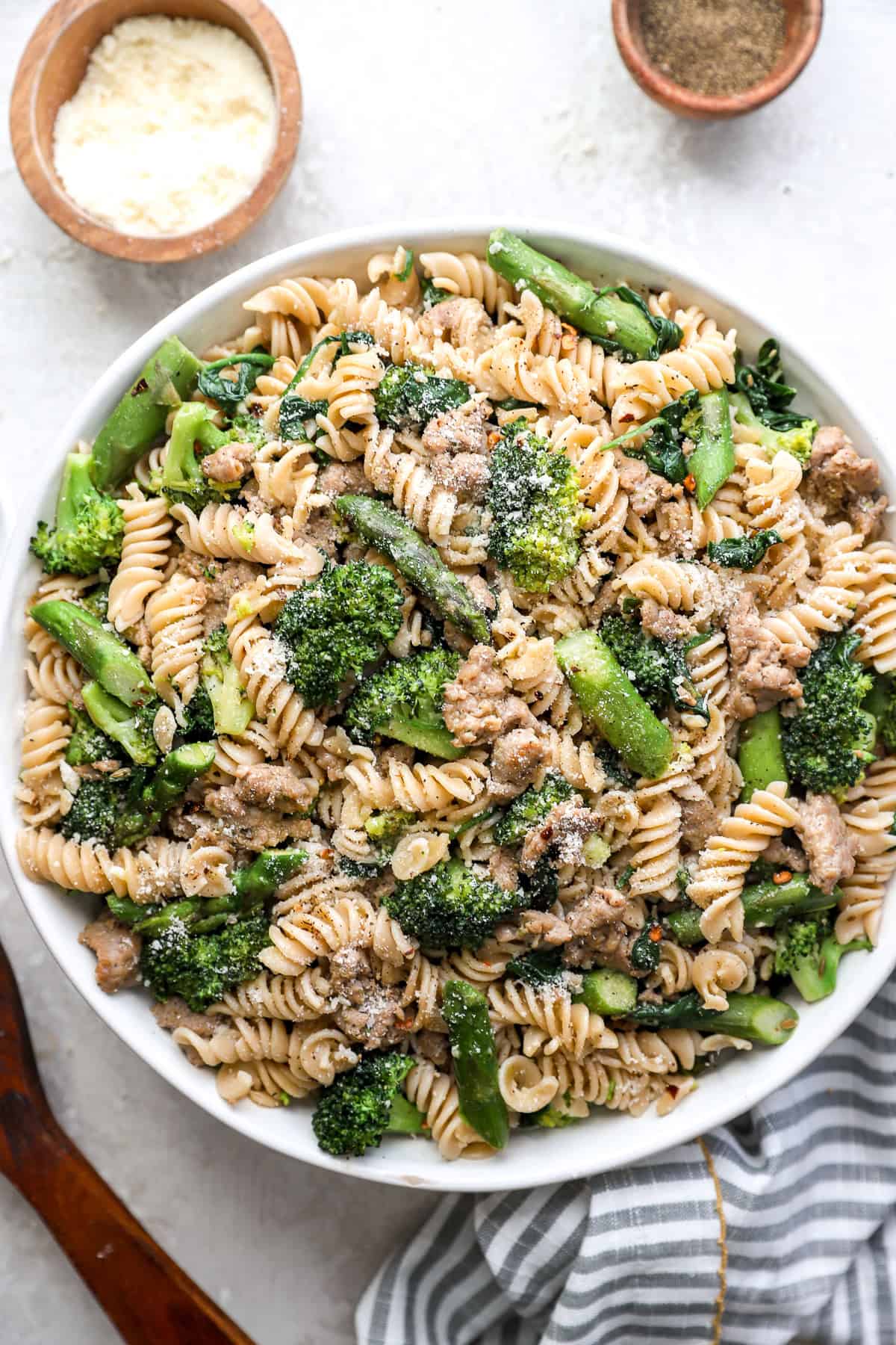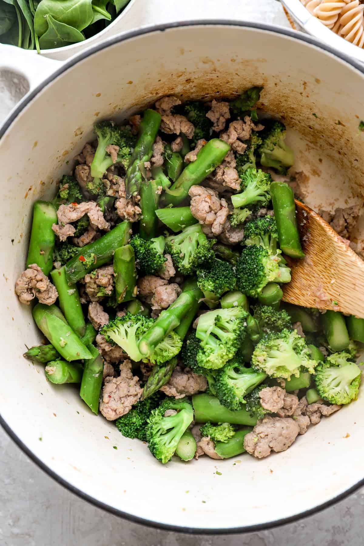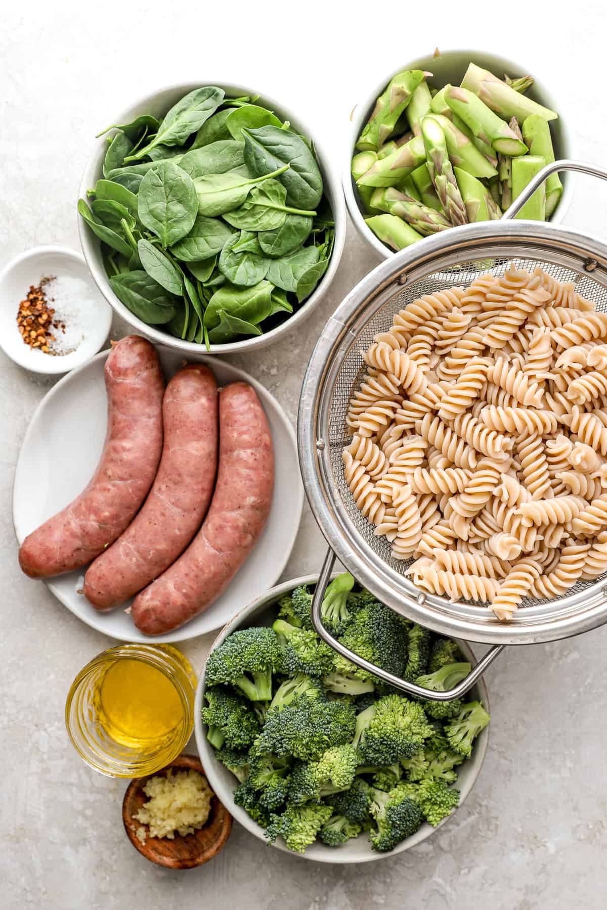 • Asparagus: Trim the woody ends and lower into 1–2 inch items. It provides freshness and pairs completely with the sausage and pasta.