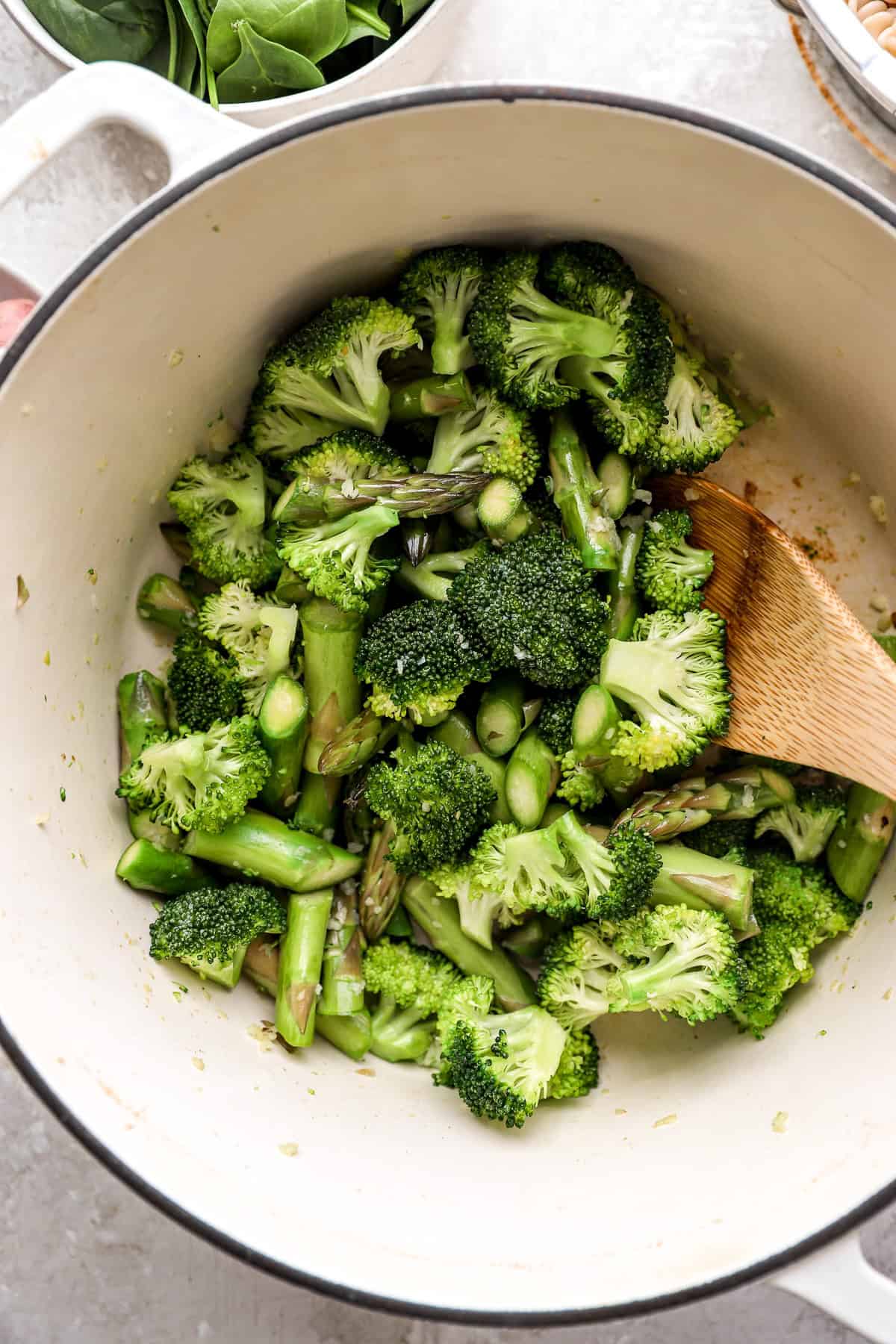 2. SautΓ© the garlic and greens: In the identical pot, warmth olive oil over medium warmth. Add the garlic and prepare dinner till aromatic. Stir within the broccoli and asparagus and prepare dinner till the greens are tender.