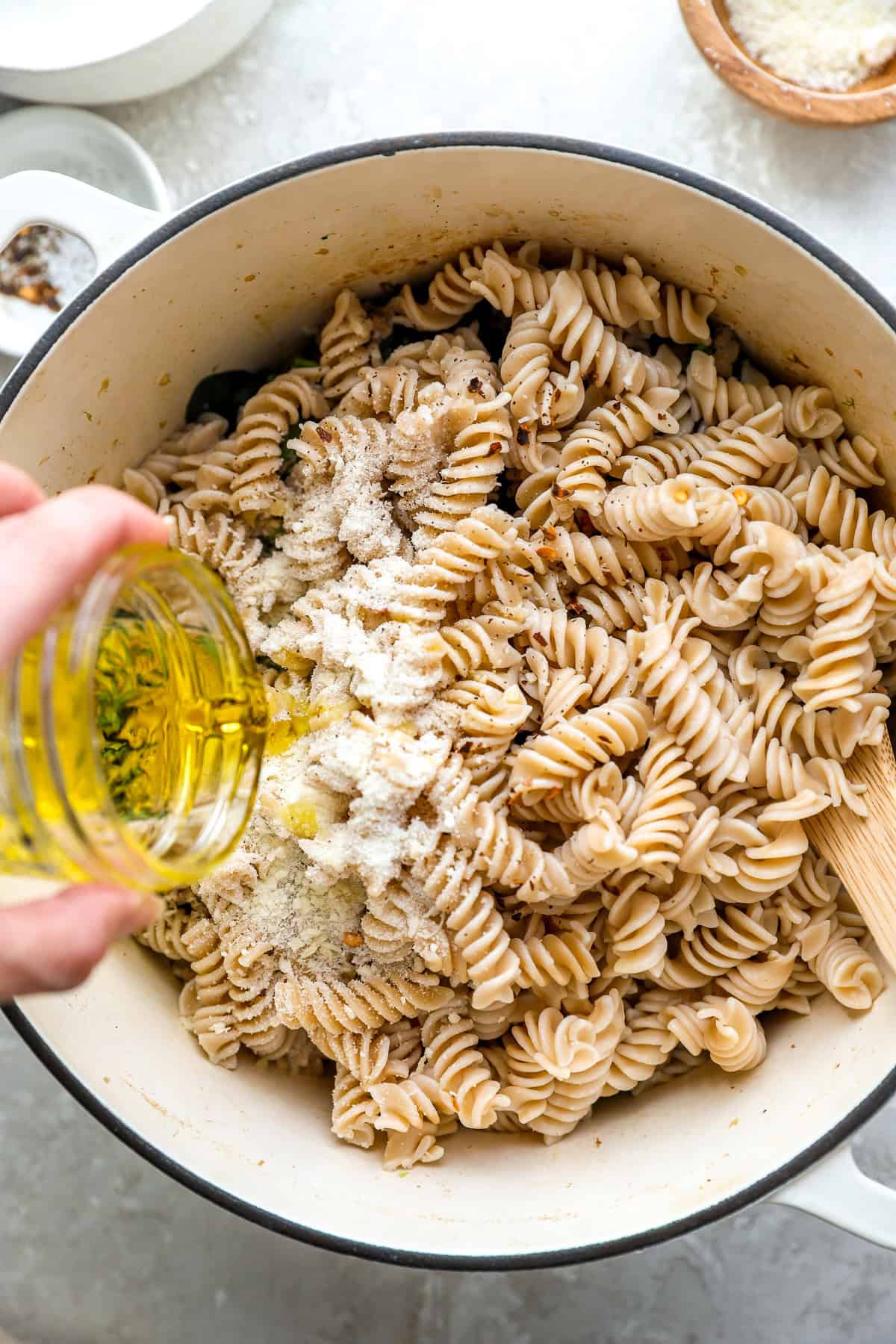 • Add the pasta into the pot, add remaining olive oil, and salt, pepper, purple pepper flakes, and parmesan if including. Style and regulate spices as desired.