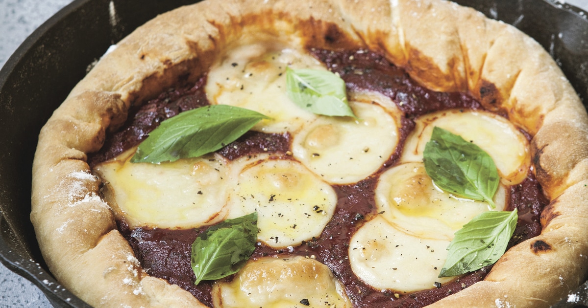 You’ll be able to simply change up this deep-dish pizza from the So Vegan in 5 cookbook by including your favourite vegan meats, extra cheeses, or roasted greens.