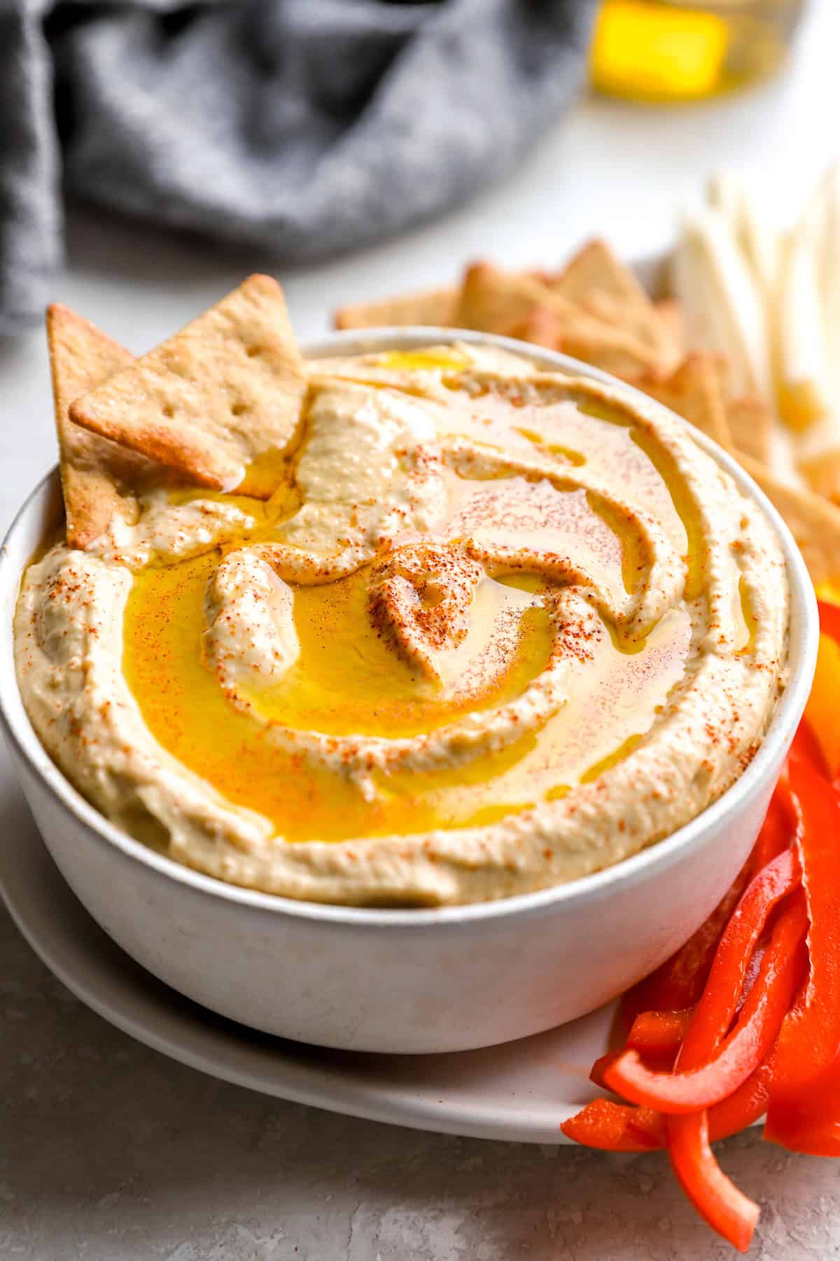 Serve with: With recent veggie sticks — carrots, cucumber, bell peppers, celery, broccoli. With pita bread, pita chips, or gluten-free crackers. Unfold on toast or in wraps — hummus makes an amazing sandwich base, changing mayo, and it’s a dip or condiment for grilled veggies, roasted meats, or falafel.