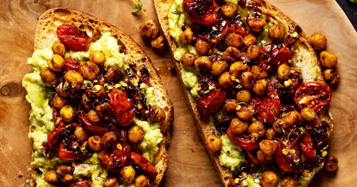 - On a plate, add toasted bread and prime with spoonfuls of mashed avocado, spreading evenly. High with just a few spoonfuls of roasted chickpeas and tomatoes. Drizzle with spicy maple syrup.Â