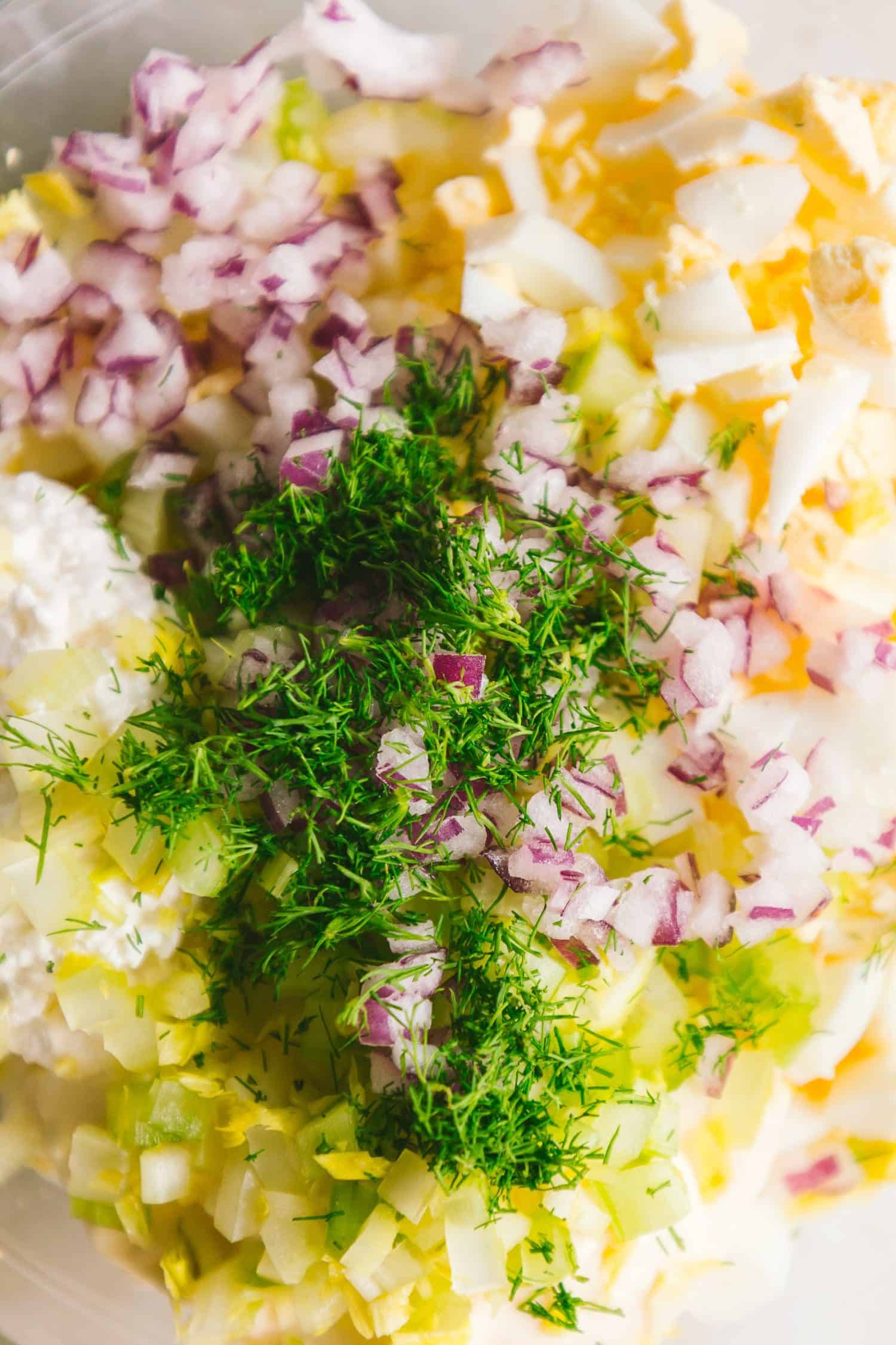 - Add mayonnaise, cottage cheese, Dijon mustard, pink onion, celery, and chopped dill (if utilizing) to the bowl. Combine every part collectively till nicely mixed. Season with salt and pepper to style.