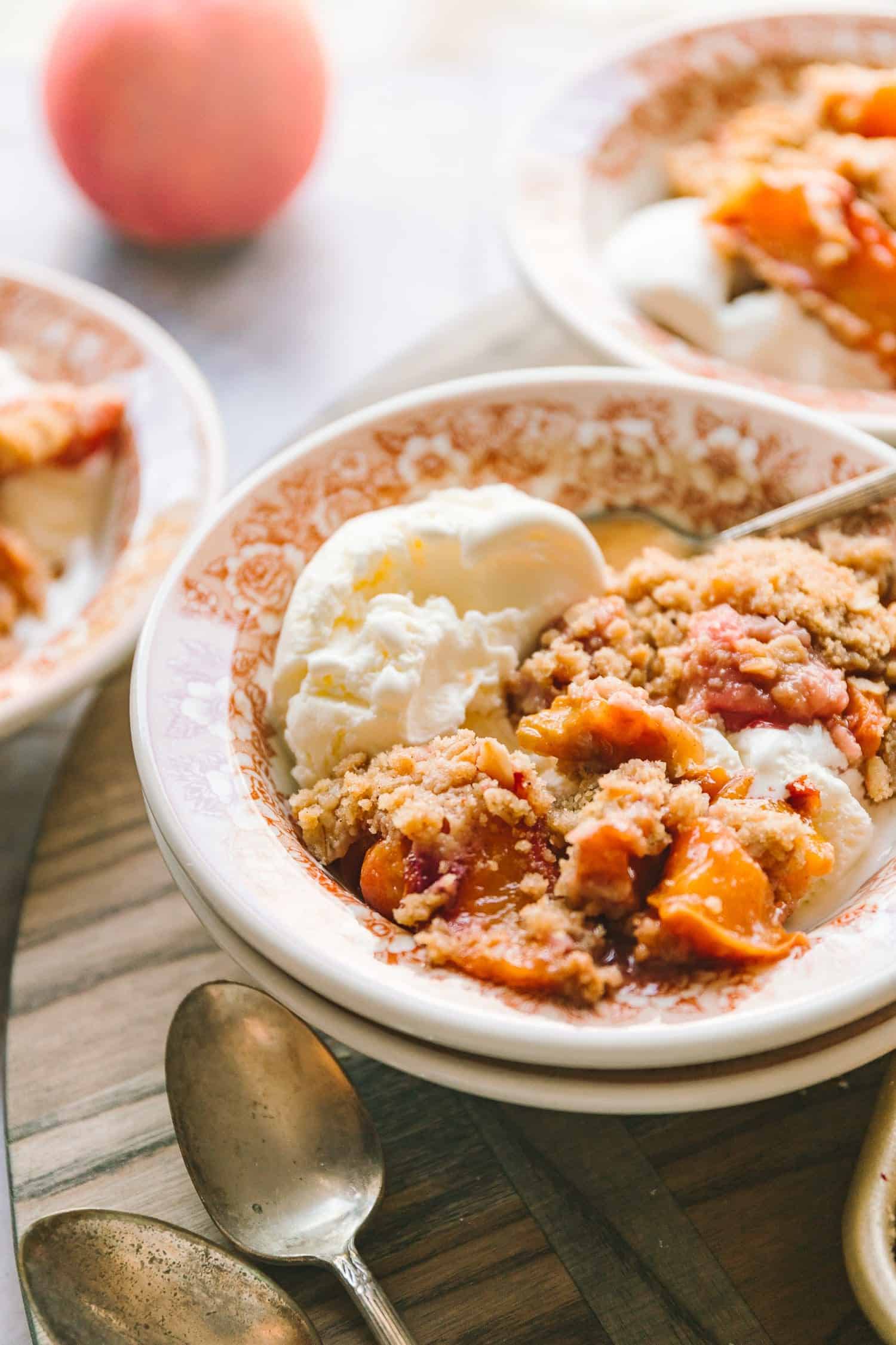 This crisp could be served screamin’ sizzling from the oven as a result of… impatience. Simply keep in mind the screamin’ sizzling half. Permit the crisp to chill to heat and most significantly, serve with a scoop of vanilla ice cream. Because the ice cream melts, it cools the cobbler and cream melds with the peach juice it’s simply the perfect factor ever.
