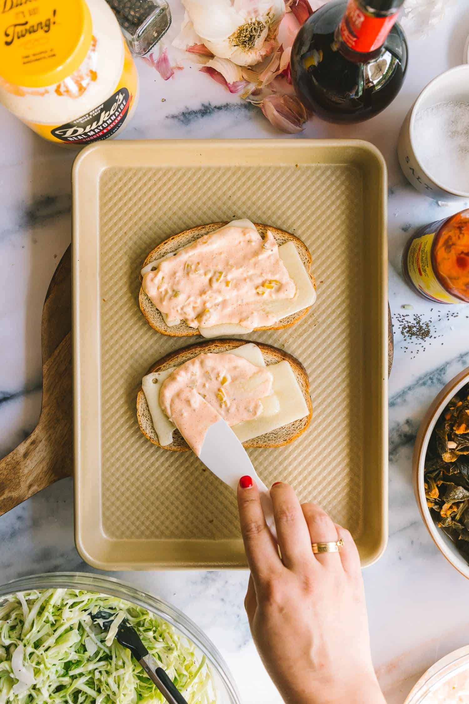 Take away the toasty and melty bread from the oven and unfold all sides generously with the home made Russian dressing.
