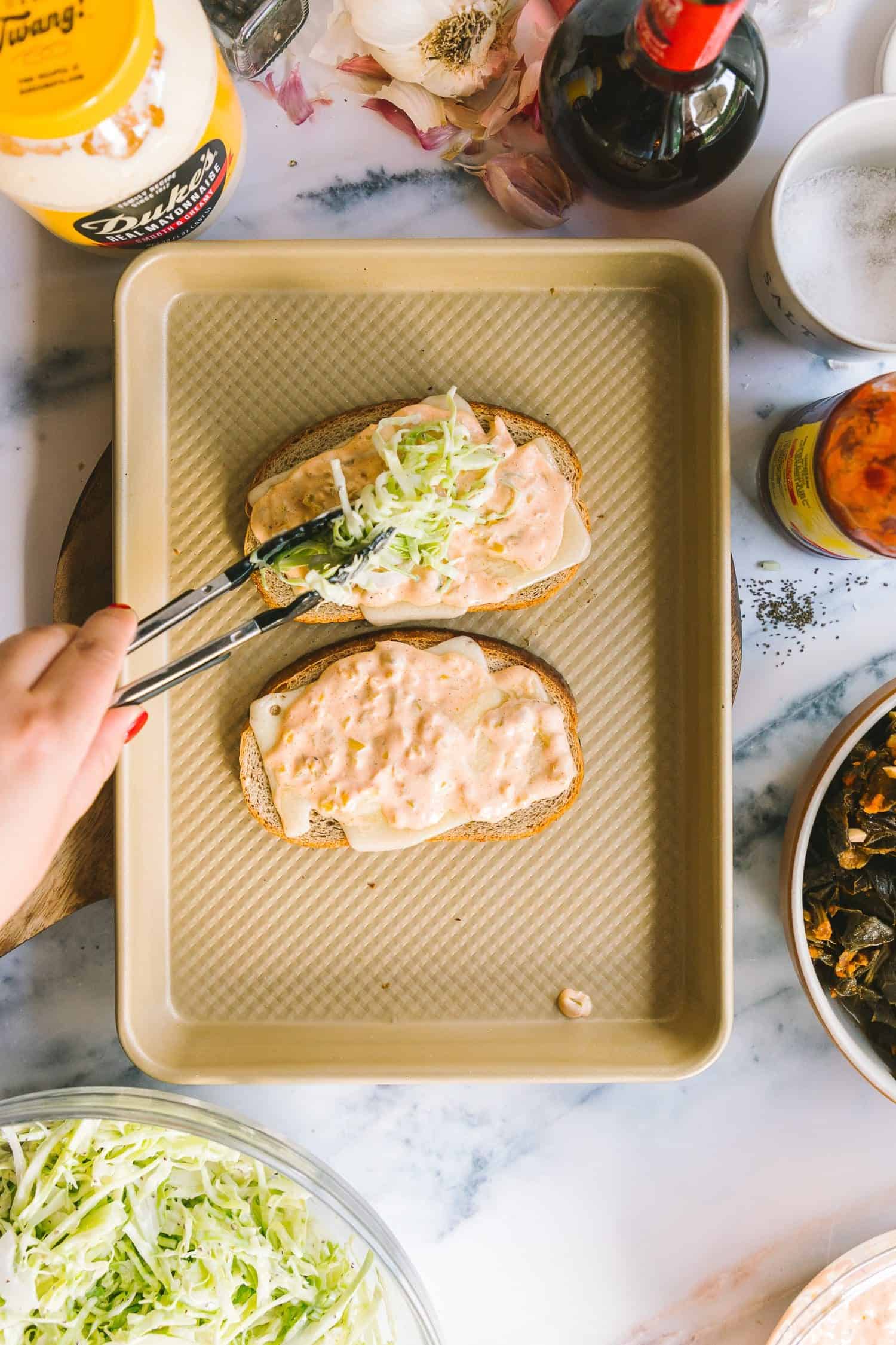 Take away the toasty and melty bread from the oven and unfold all sides generously with the home made Russian dressing.