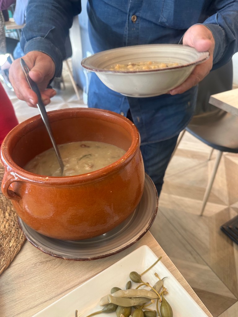 After the salad comes the large clay pot of the stew. Therefore the identify, Olla de San Antón. Olla=pot. Within the olla you can see dried fava beans, white beans, garbanzos, rice onion, fennel, and bits of the meat that had been cooked together with these elements. A plate of encuritdos, pickled greens, is at all times served to help in digestion.