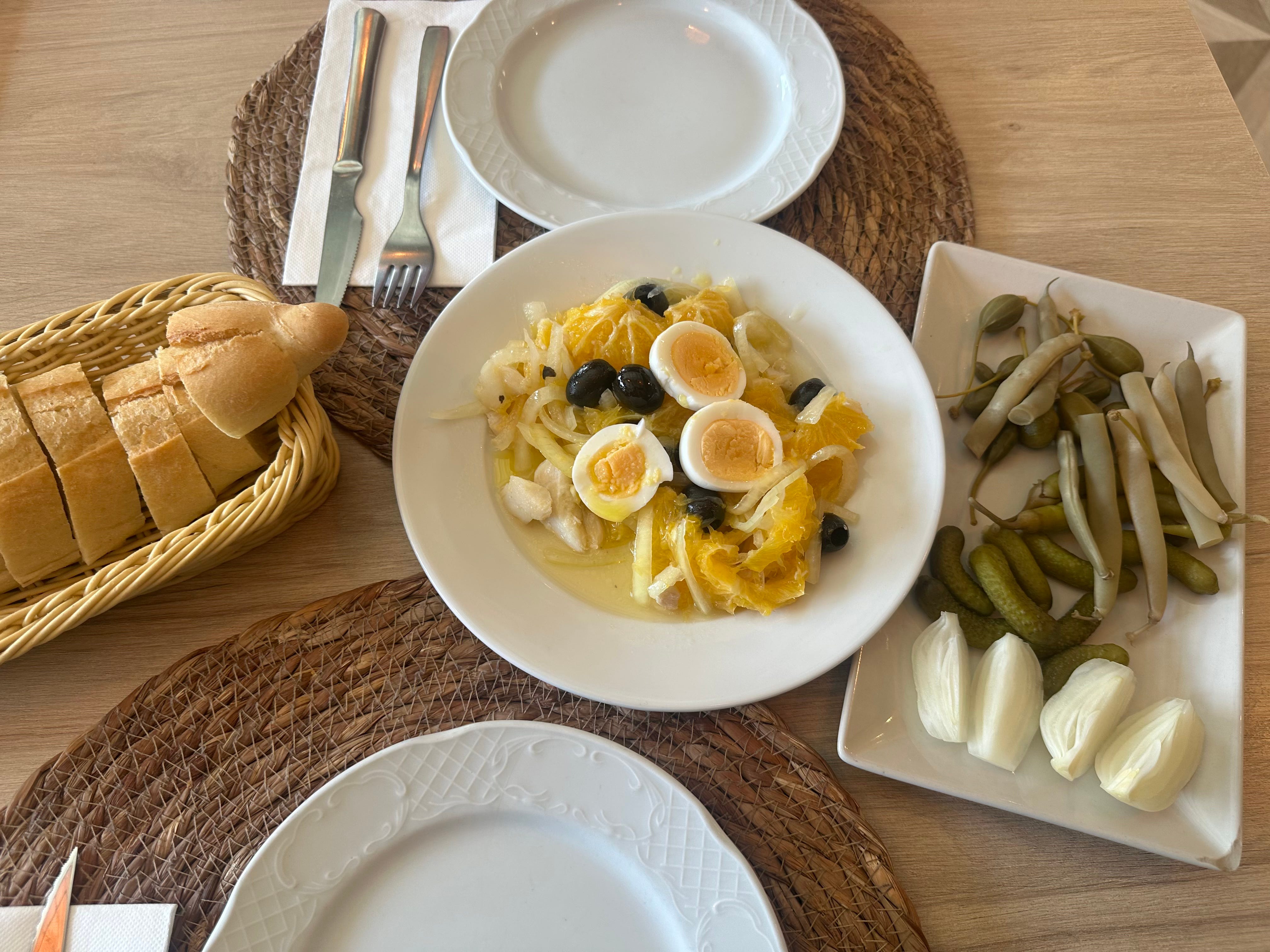 The primary course is Remojón Granaína, a salad ready with salt cod, orange slices, boiled egg and black olives.