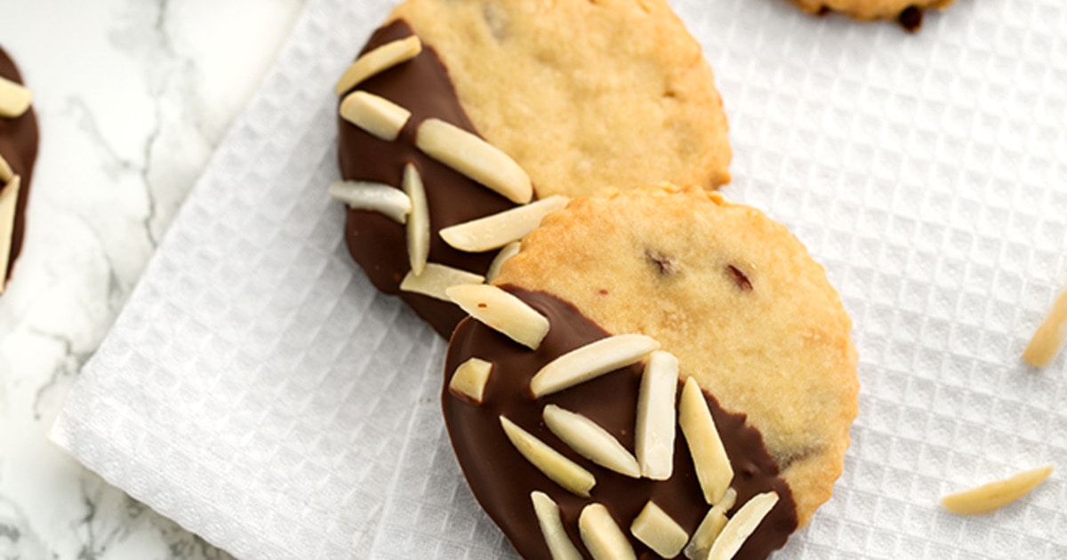 6. To assemble, dip half of every cookie into melted chocolate, place onto baking sheet, and sprinkle with almonds.