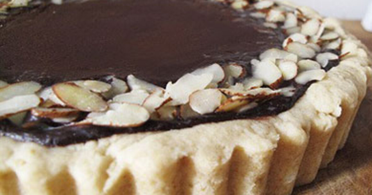 - For the filling, in a small pot, soften chocolate till it softens. In one other small pot, convey espresso to a boil. Pour espresso over softened chocolate and stir combination till clean. Add cornstarch, vanilla, and salt to combination. Pour filling into cooled crust. Place tart in fridge and chill 6 hours. Adorn prime of tart with slivered almonds alongside fringe of crust as desired, then slice and serve.