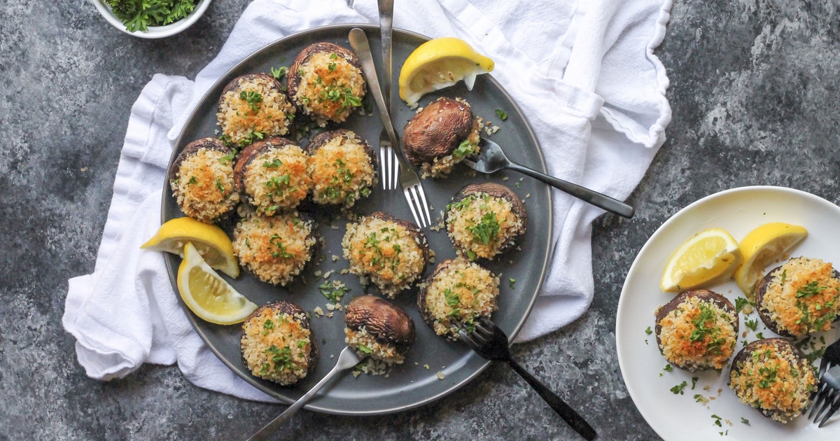 - Working with one mushroom cap at a time, rigorously spoon 2 to three tablespoons of filling into every cap. Place stuffed mushrooms on ready baking sheet and high each with a spoonful of breadcrumb combination. Bake uncovered 25 to half-hour, till golden brown and crispy on high. Garnish with minced parsley and serve instantly with lemon wedges.